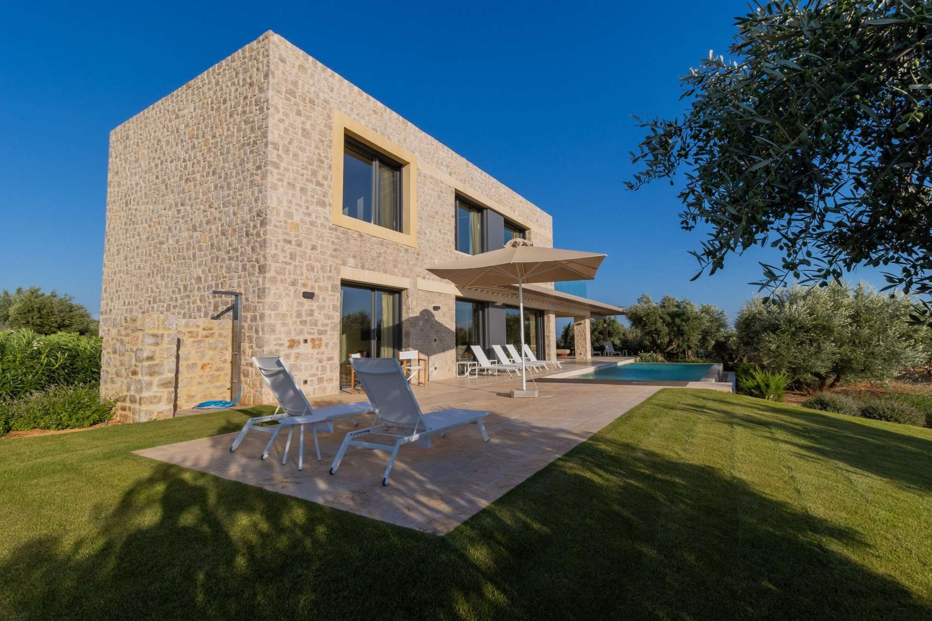 The outdoor area is dedicated to an easy-going and leisurely way of living. The stone exterior of the house blends beautifully with the verdant and wild surroundings, inviting you to reconnect with nature. There are loungers and a shaded, comfy area with a sofa to lie on and relax, listening to your favorite song while basking under the summer sun. No worries if it gets too hot, there is a private pool nearby to plunge into and cool off. As Greek as it gets, there is also a shaded dining area with a BBQ to test your cooking skills and honor the legendary Mediterranean cuisine.