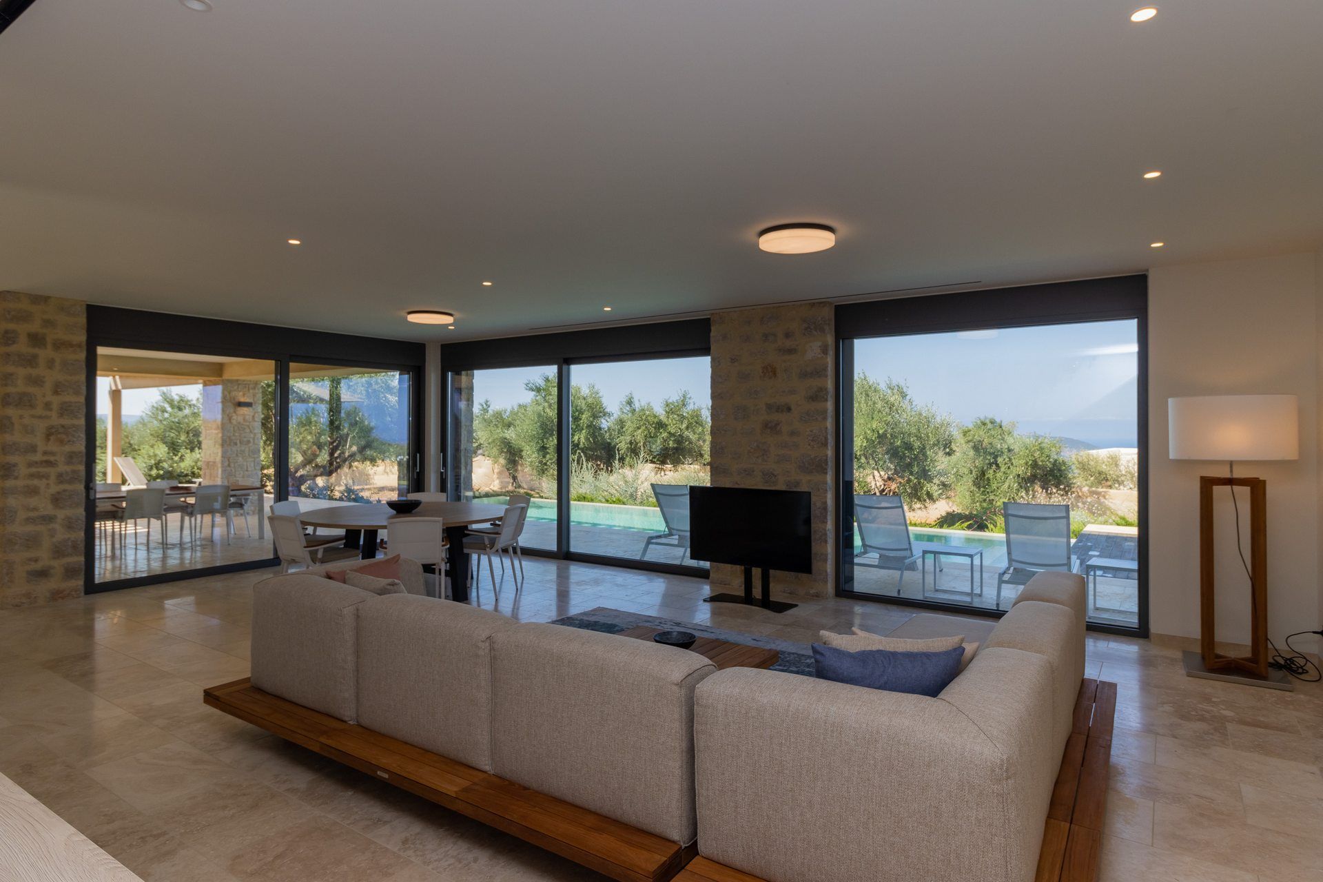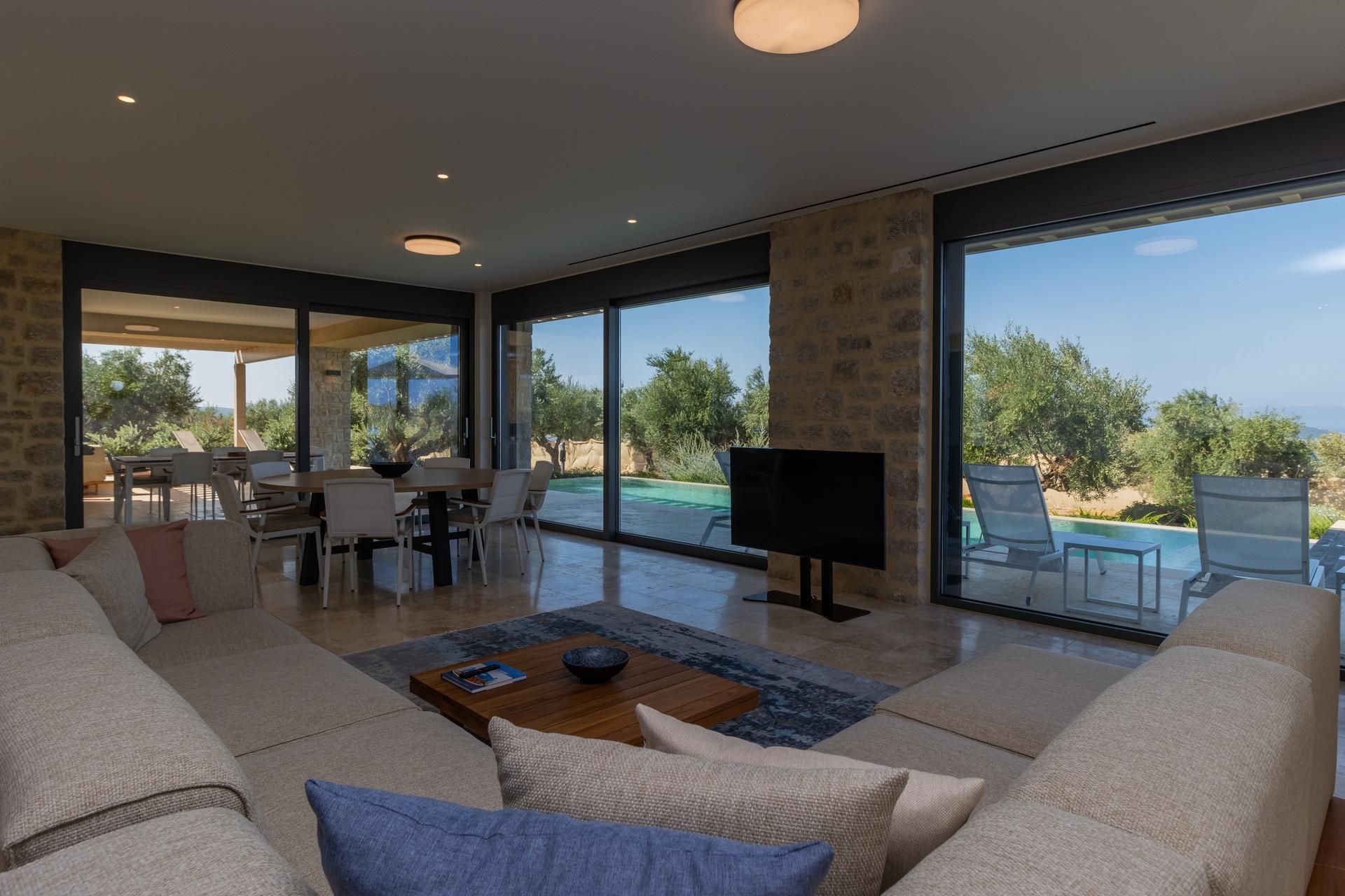 Living area with sofa, smart TV, access to the pool terrace, pool view