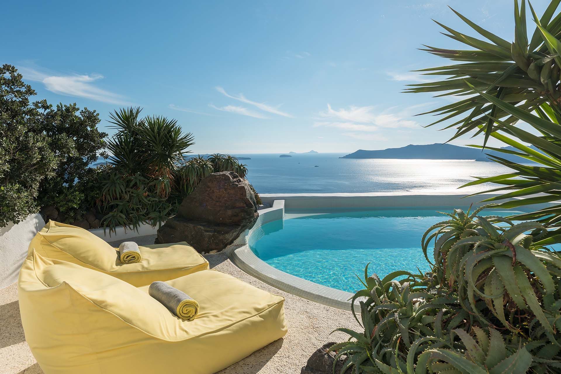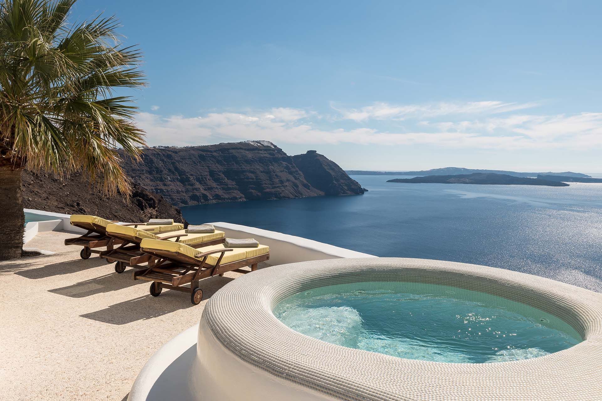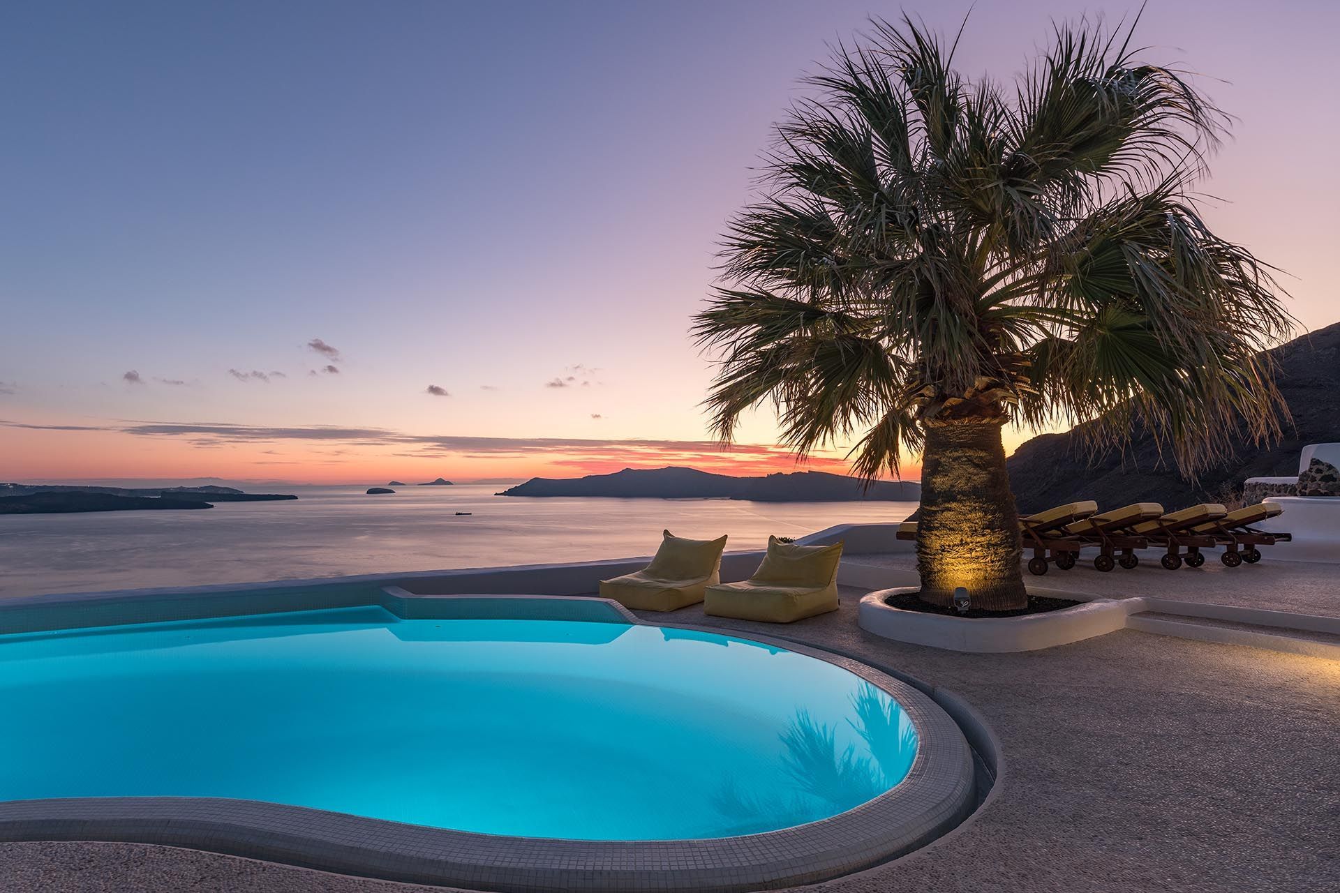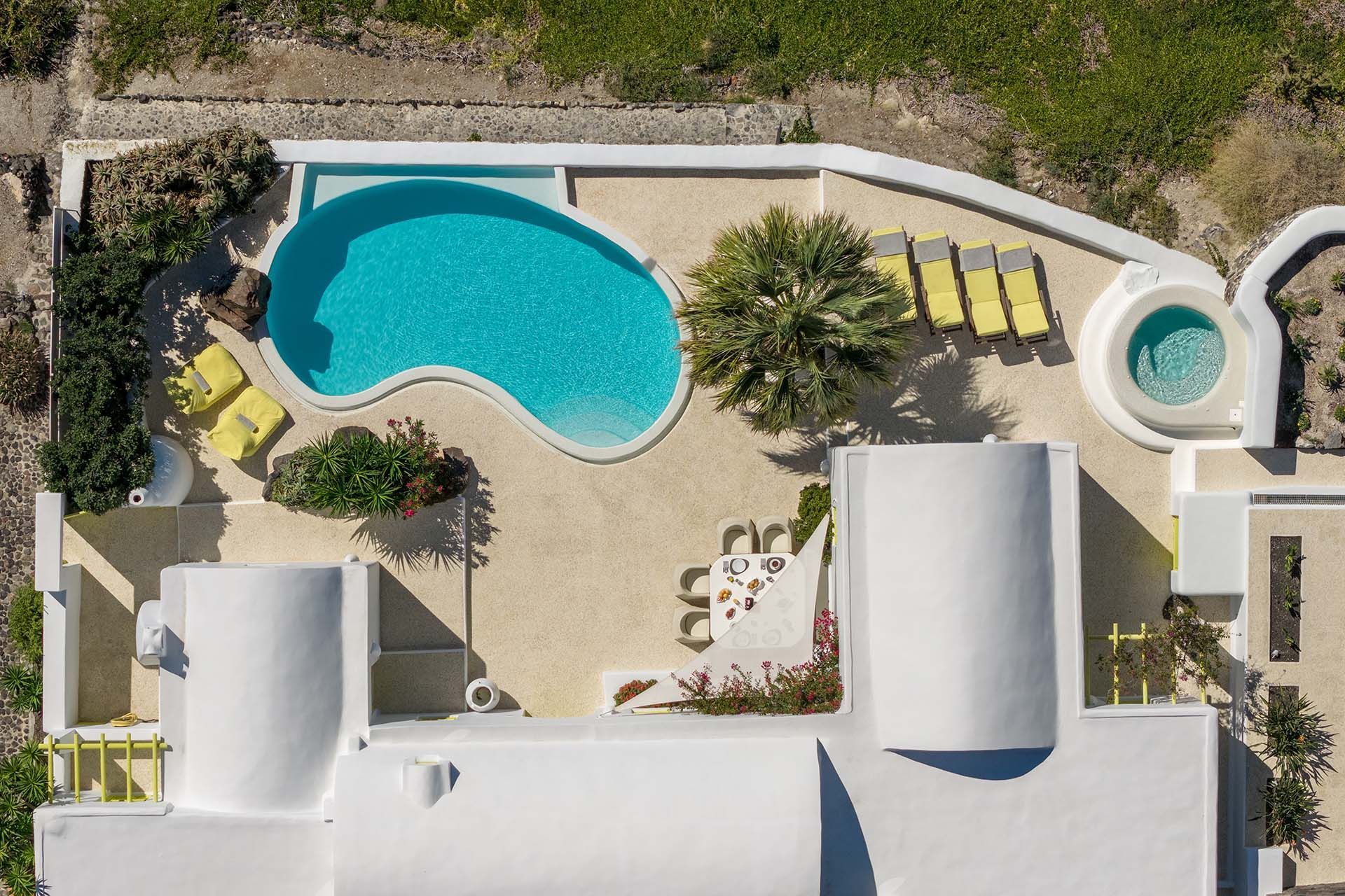 The smooth geometric shapes of the famed Cycladic architecture greet you as you approach the villa’s private gate. The large outdoor terrace features a gorgeous designer shaped swimming pool with full caldera and volcan views, surrounded by palm trees, local shrubs and rock features that blend into the caldera cliffside. There is also a separate jacuzzi whirlpool, sun loungers, and a shaded area for alfresco dining. Totally secluded and private, the outdoor area is as striking as the interiors.