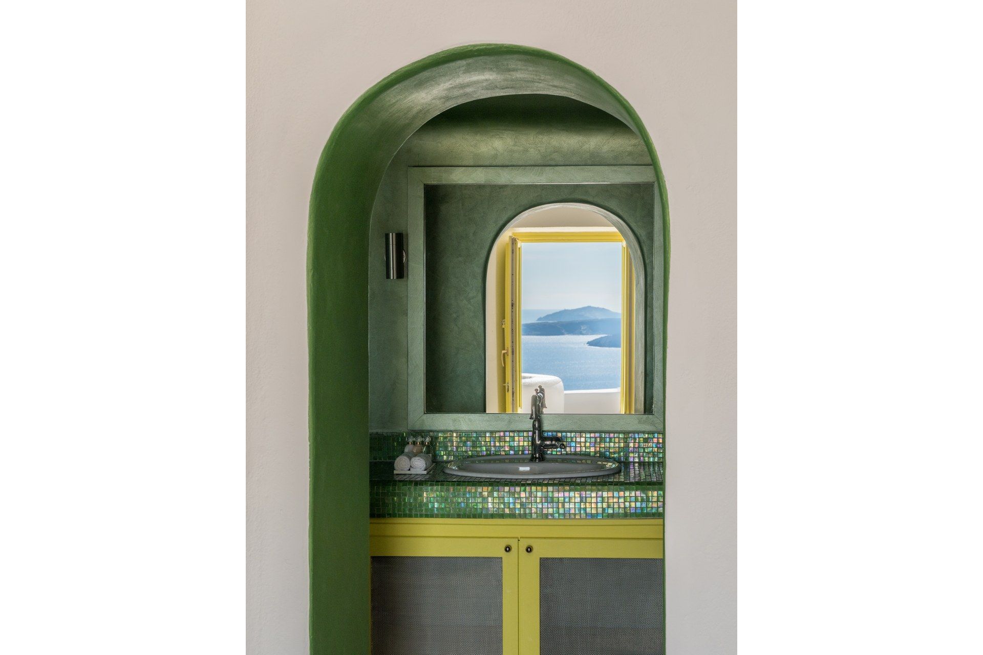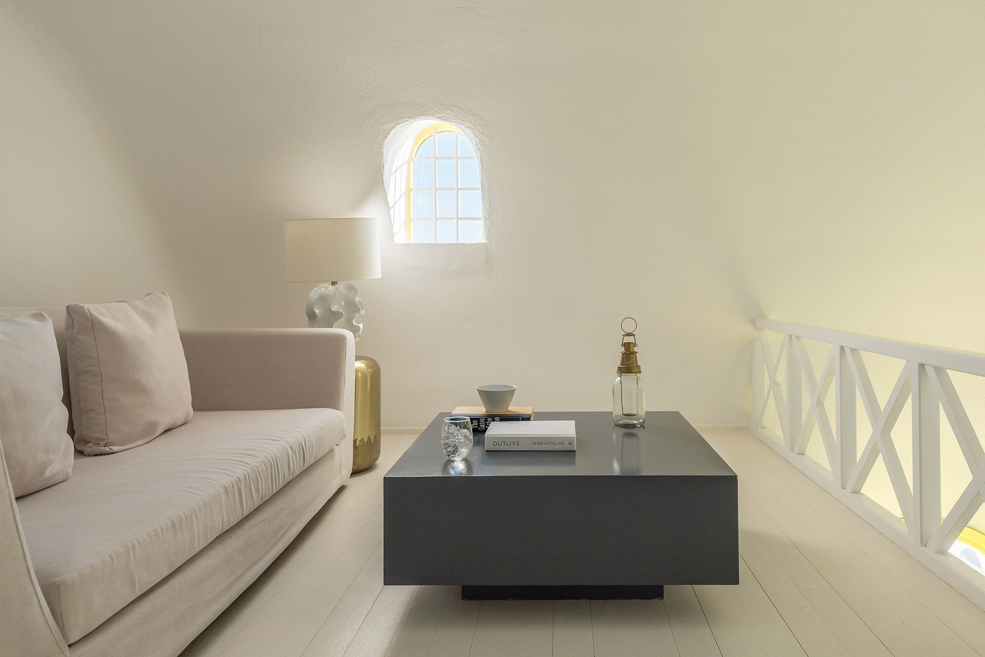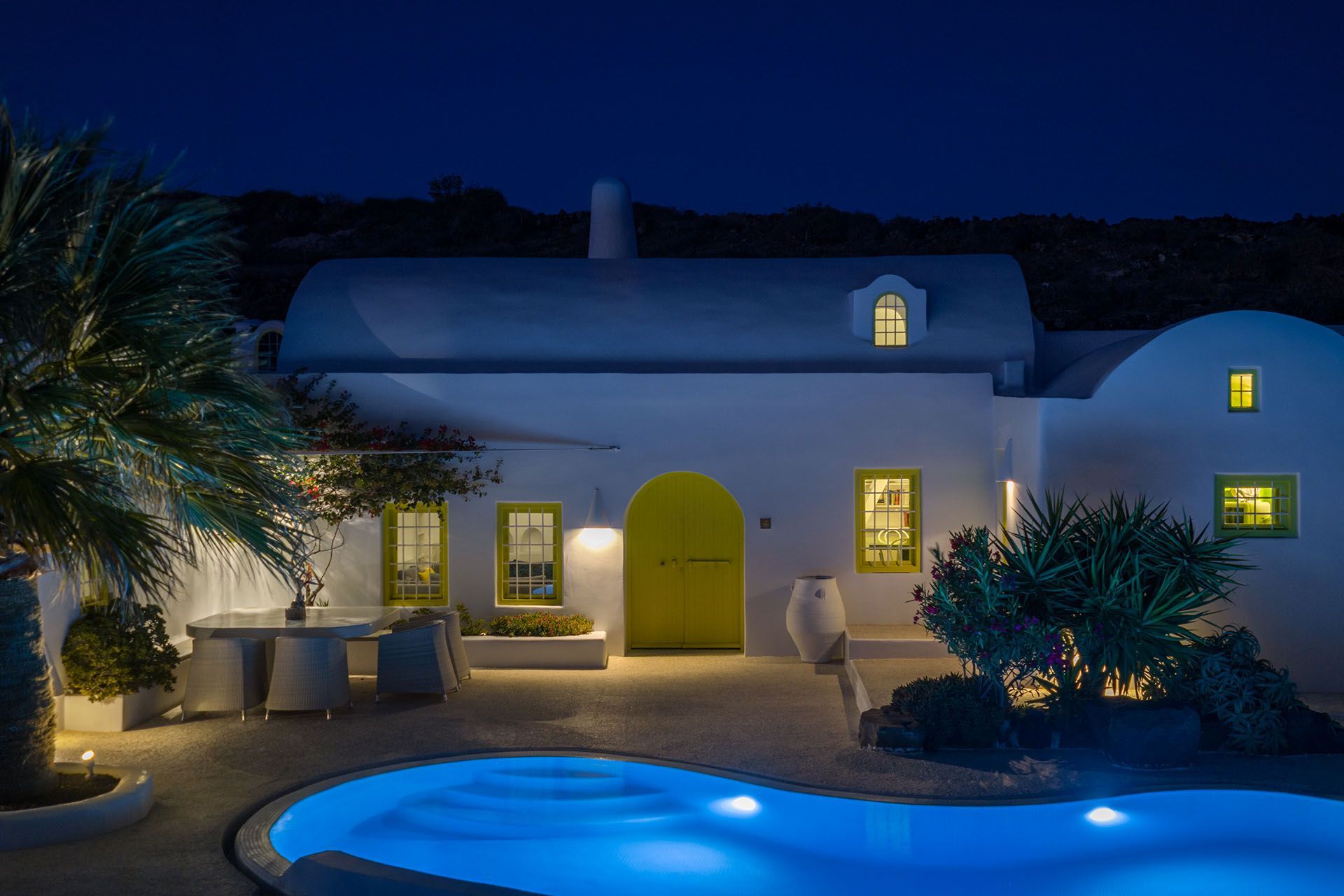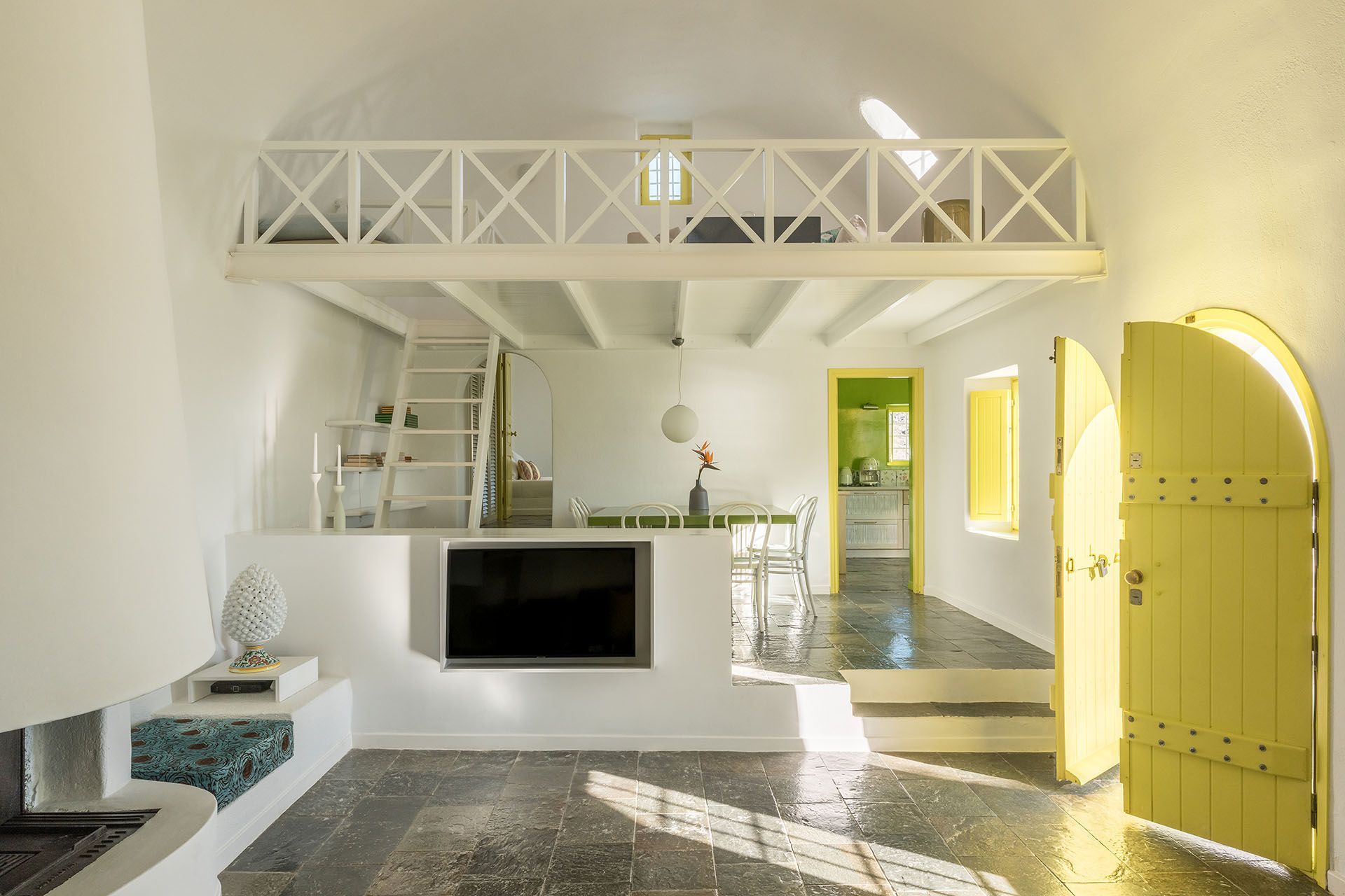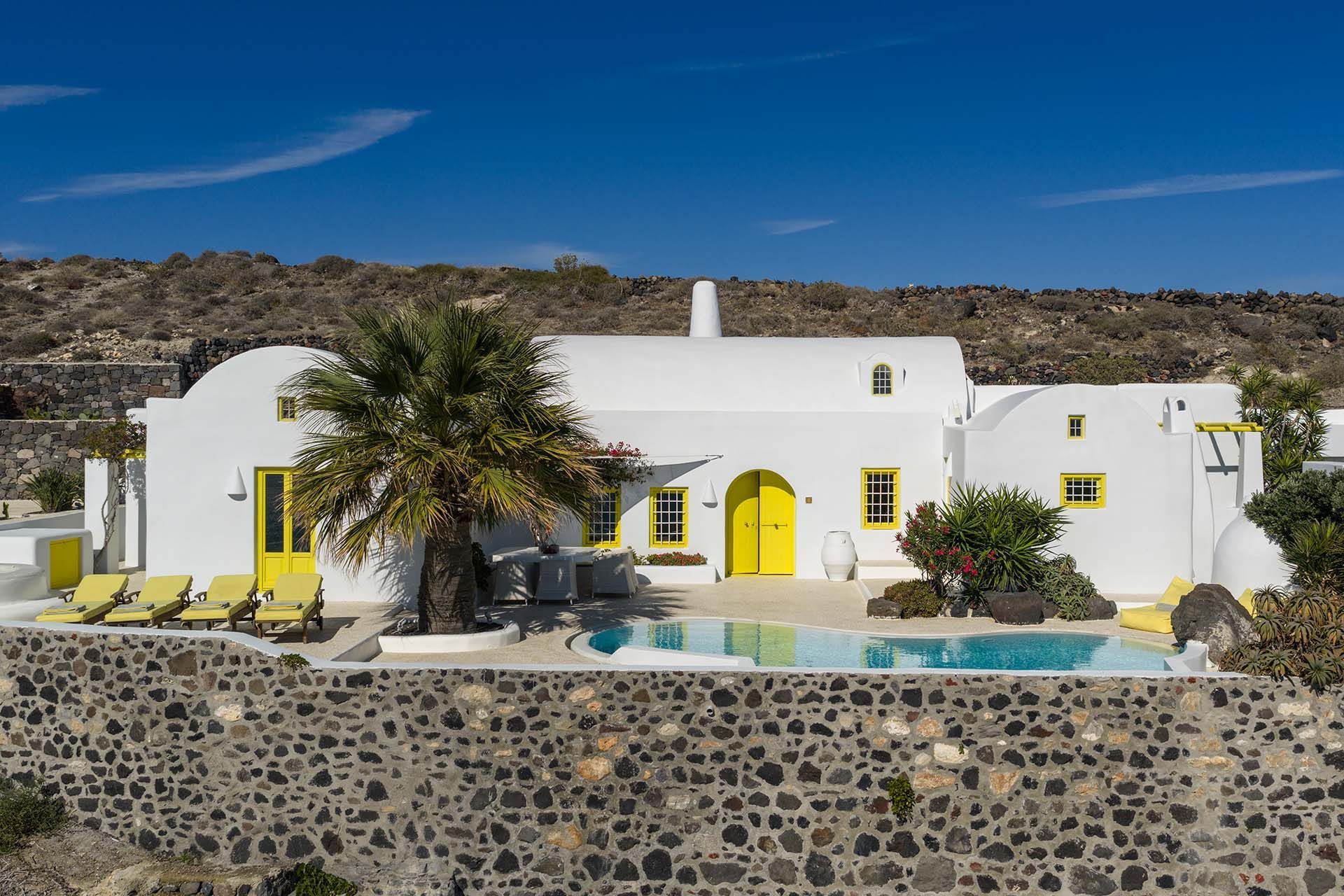 Architect’s House is fully harmonised with the natural environment. It features the traditional canava-building technique of Santorini, with cool white walls and smooth lines and arches, along with large windows to let the view in. The main open-plan living space features comfy sofas, a cozy fireplace, and a dining area. Off the living room is the bright fully equipped kitchen, and there is also a stair ladder by the dining area to take you up to the loft lounge area for quiet private moments. On this same level you will also find 3 gorgeous bedrooms with access to the pool terrace.