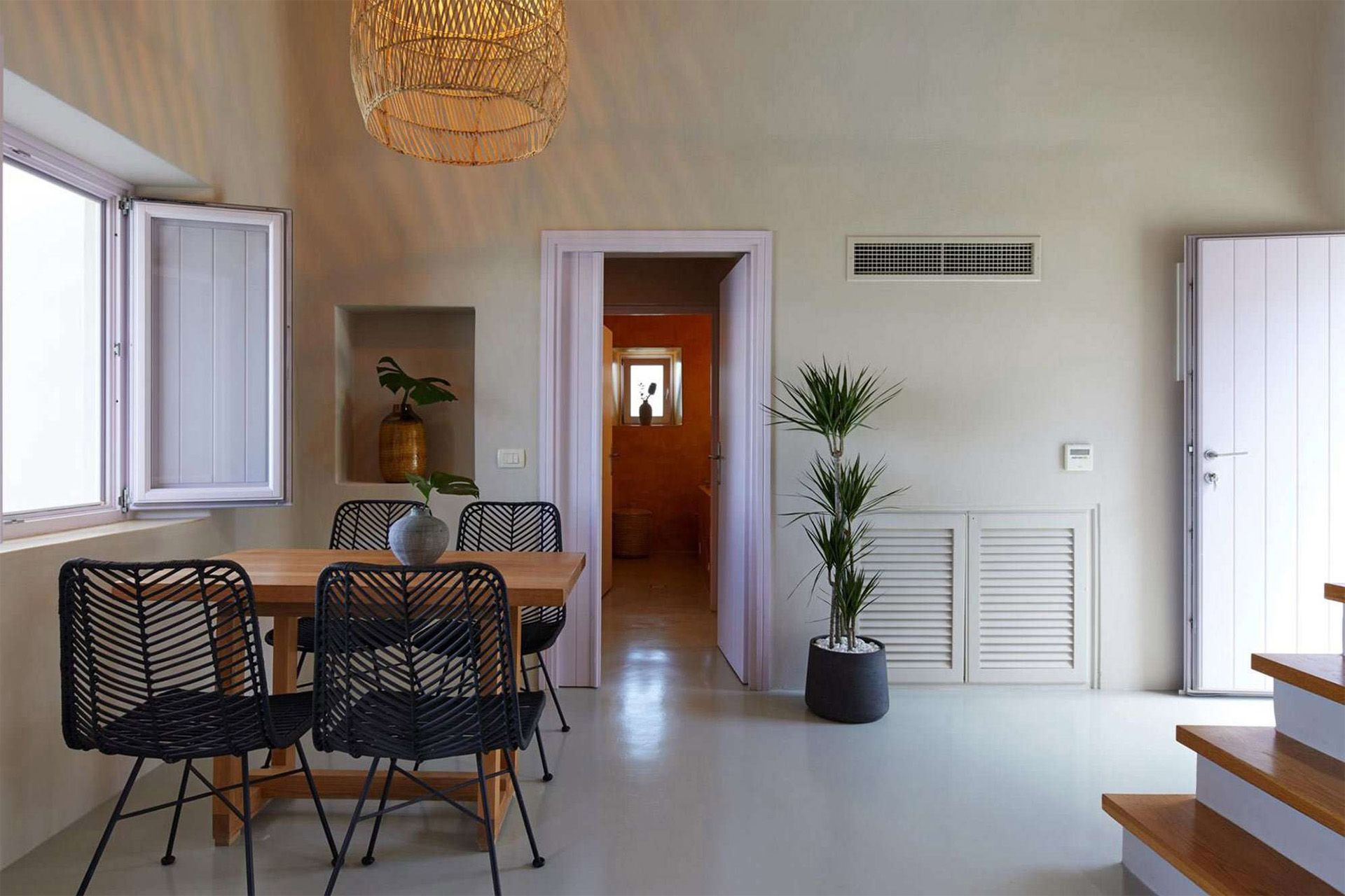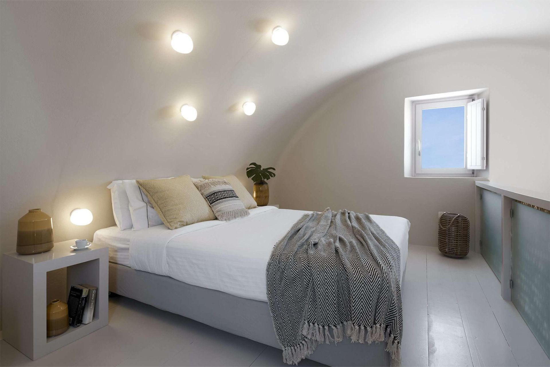 The living space is bright and harmonious, featuring designer pieces carefully chosen to blend with the view. The Cycladic arched ceilings and the handmade wooden details make Aurora a uniquely modern yet traditional villa. There are two large bedrooms, stone-built bathrooms with rain shower, and a mezzanine bedroom above the living space, accessed by an internal staircase with handrail. Netflix streaming, luxury bath toiletries, robes & slippers, home cooked breakfast served in-villa and room service add simple comforts between days out.