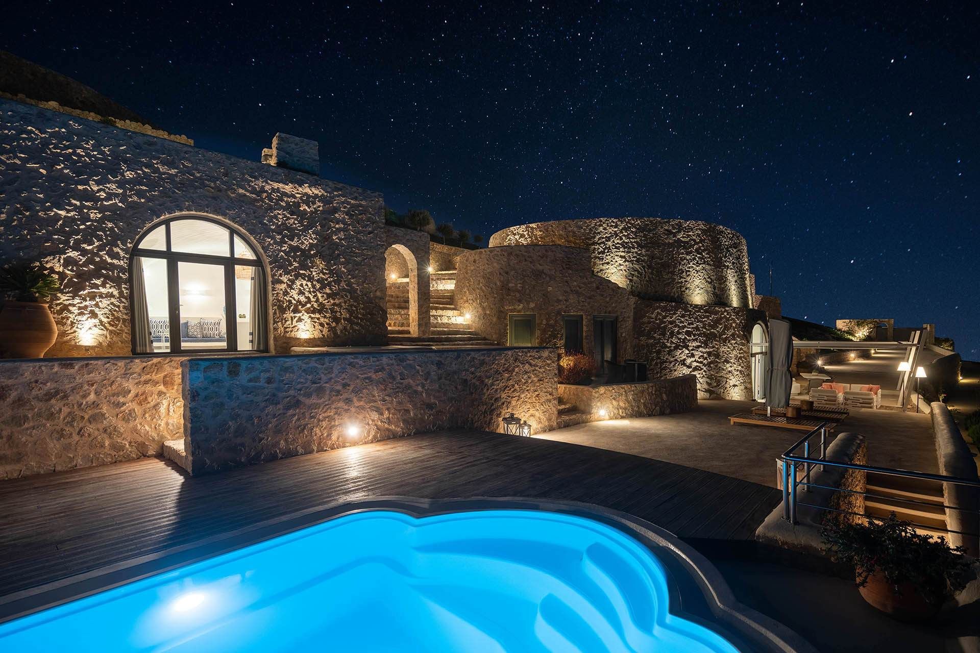 Celadon follows Cycladic traditional architecture and uses eco-friendly materials throughout. The former cylindrical lime kiln has been ingeniously converted into the living and kitchen area, crowned by a shaded skylight that floods the space with natural light. The layout is oriented so most rooms enjoy the same exceptional view. Sleeping arrangements include a master suite, a standalone guest suite, and an upper three-bedroom suite—each ensuite and ready to host up to 10 guests.