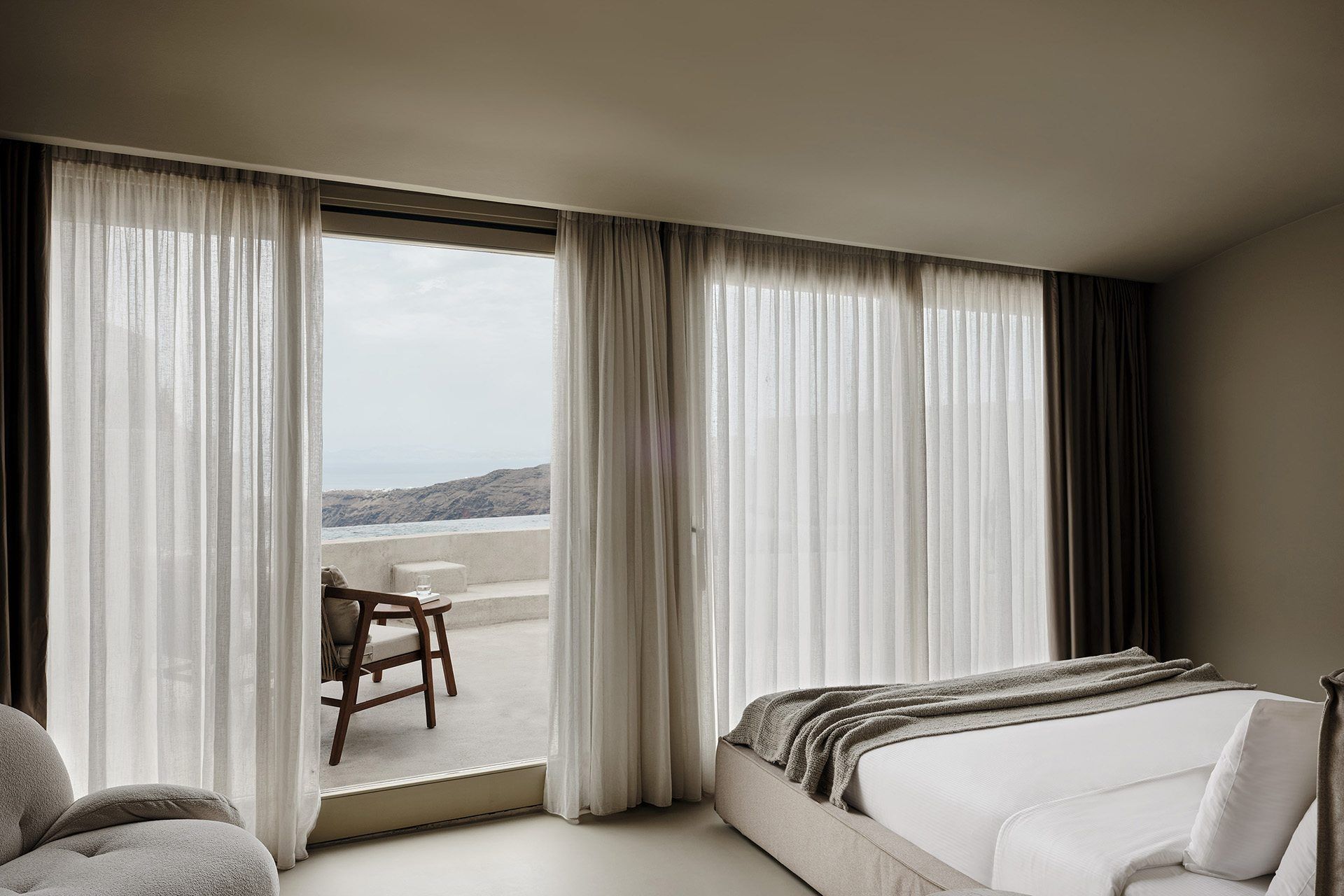 1 master bedroom with king size bed, A/C, en-suite bathroom, minibar, espresso machine, kettle, safe box, 43” TV, access to balcony, sea, sunset and caldera views