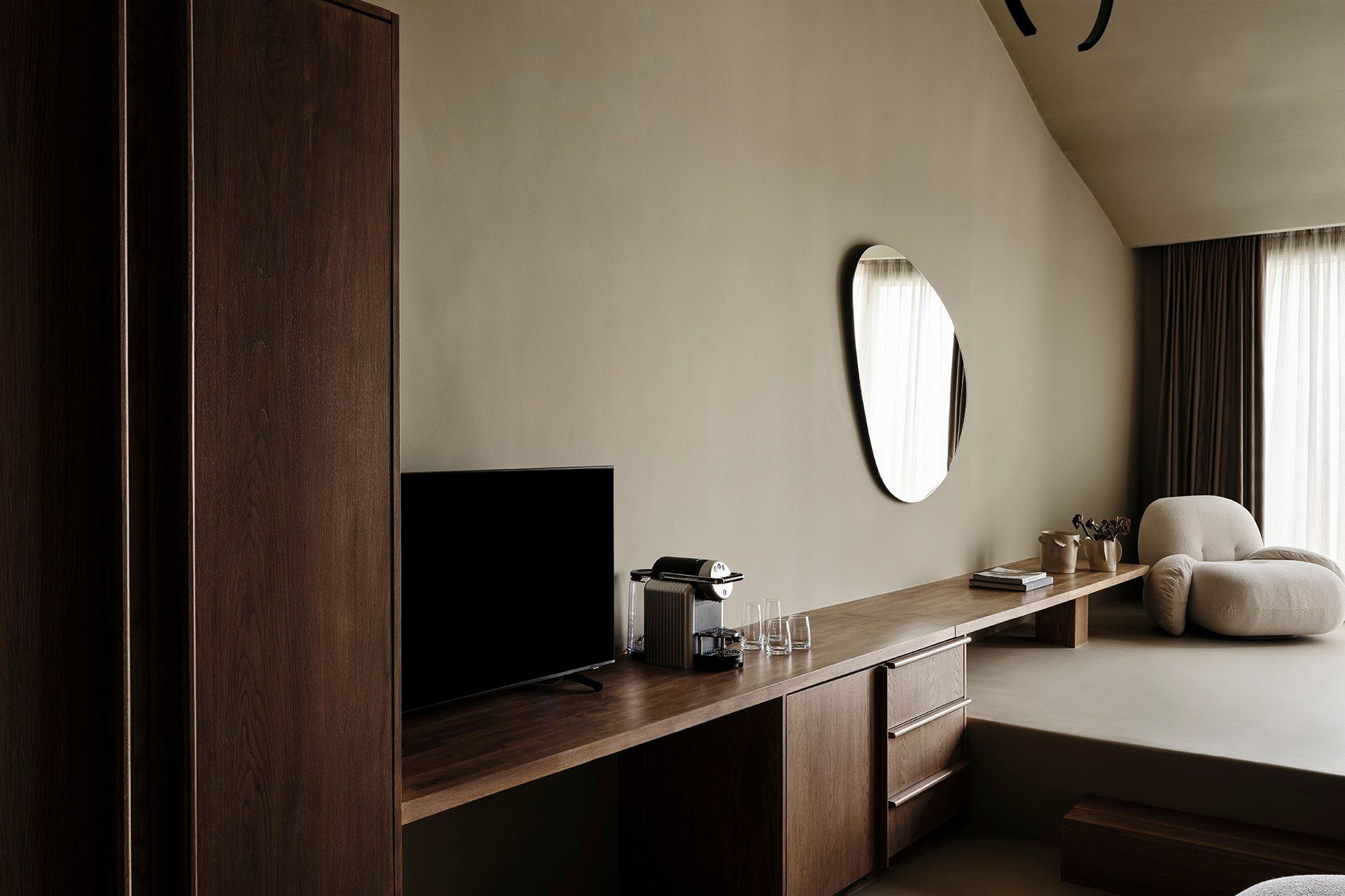 2 bedrooms, each with round queen size bed, A/C, en-suite bathroom, 43” TV, safe box, minibar, espresso machine, kettle, access to balcony, sea view