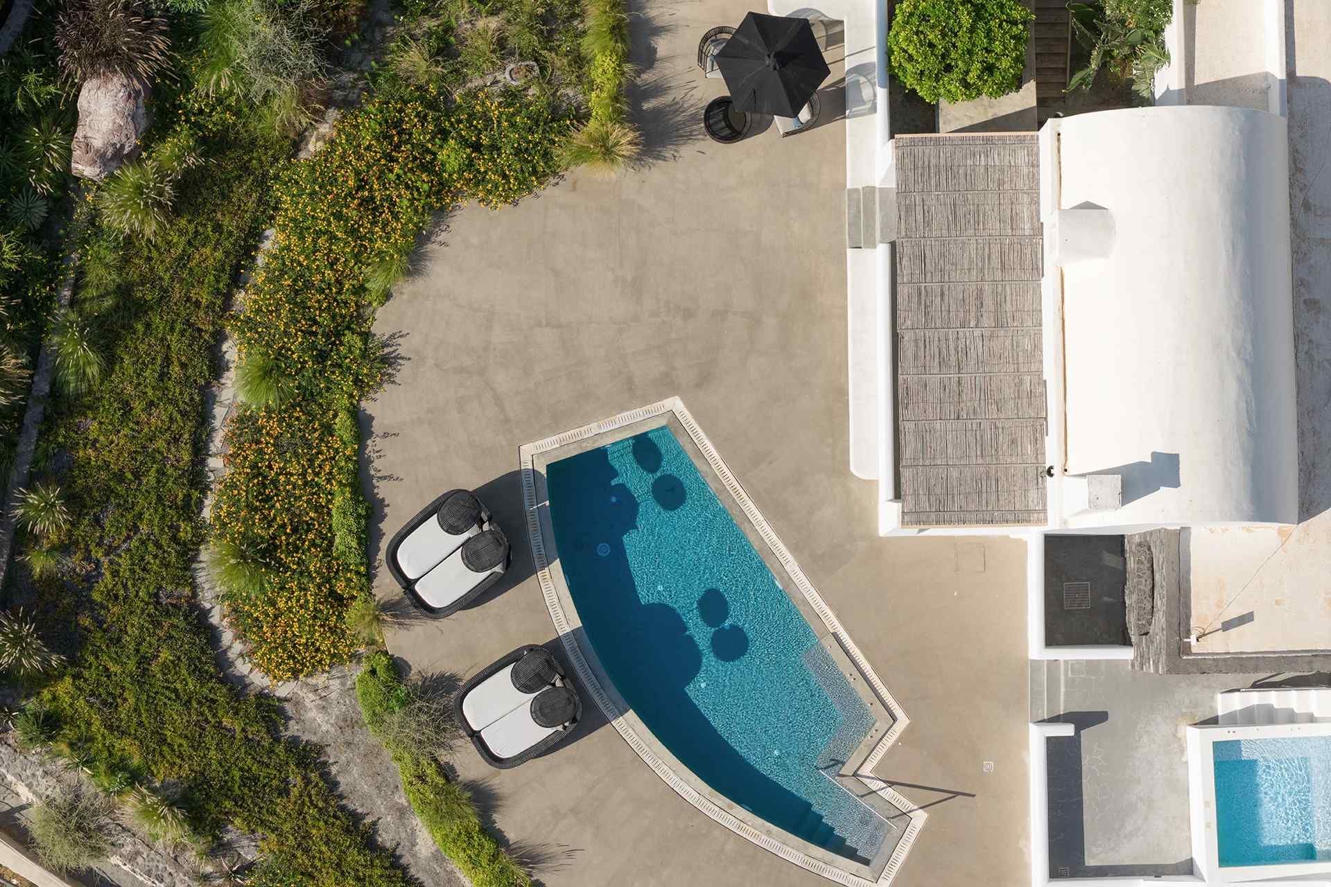 The large designer terrace at the back of the villa, facing the sea, will be your private platform to unwind. Grey local stone frames a private pool with jacuzzi jets, alongside sun loungers, a heated jacuzzi, and a shaded lounge corner with comfy chairs—an easy setup for slow mornings and long afternoons, oriented toward the quieter side of Oia.