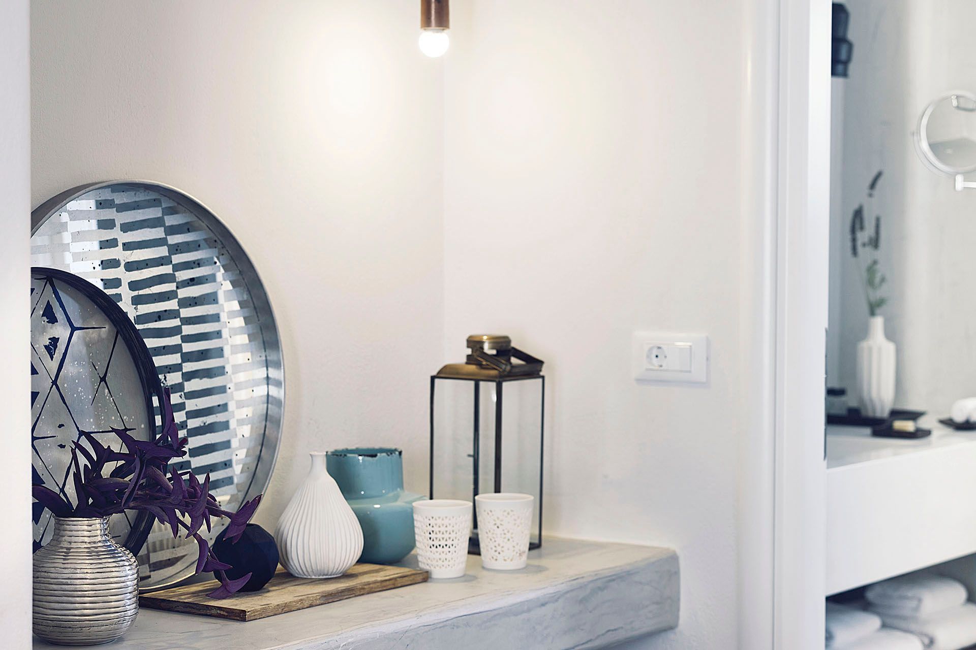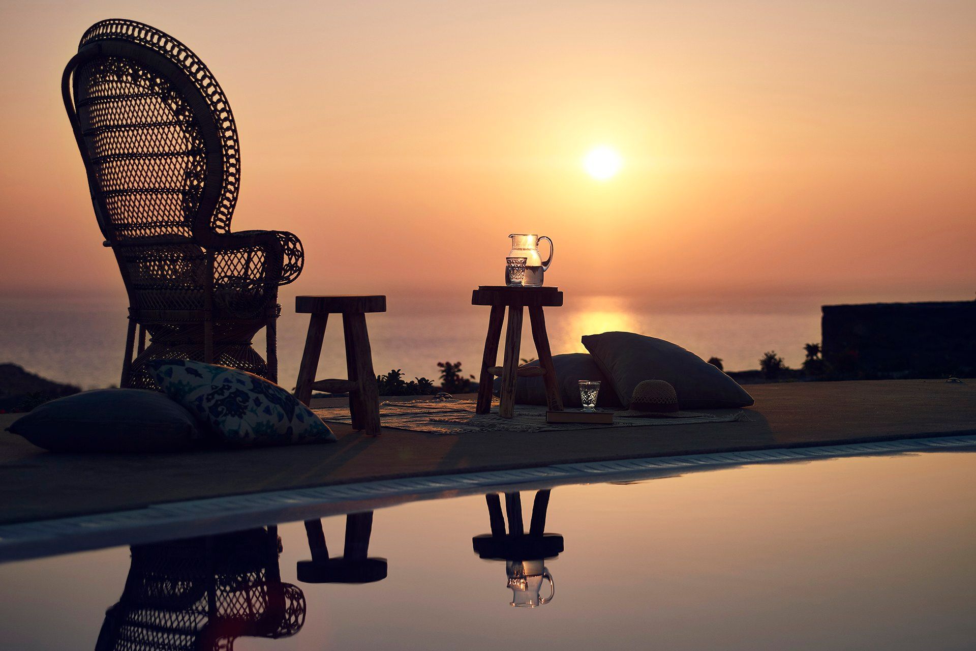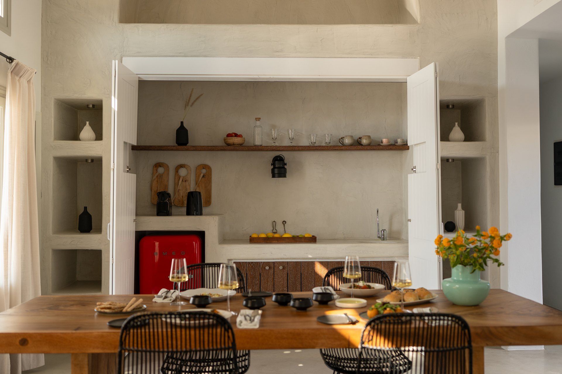 Staying at Ilios also means access to hotel-style services, including a daily breakfast buffet, housekeeping, turndown service, a pillow menu, and room service. There is also an office corner for guests who need to catch up on work during their stay. Beyond the villa, Ammoudi Bay is a short distance away—ideal for waterside taverns or a private catamaran cruise around the volcano.
