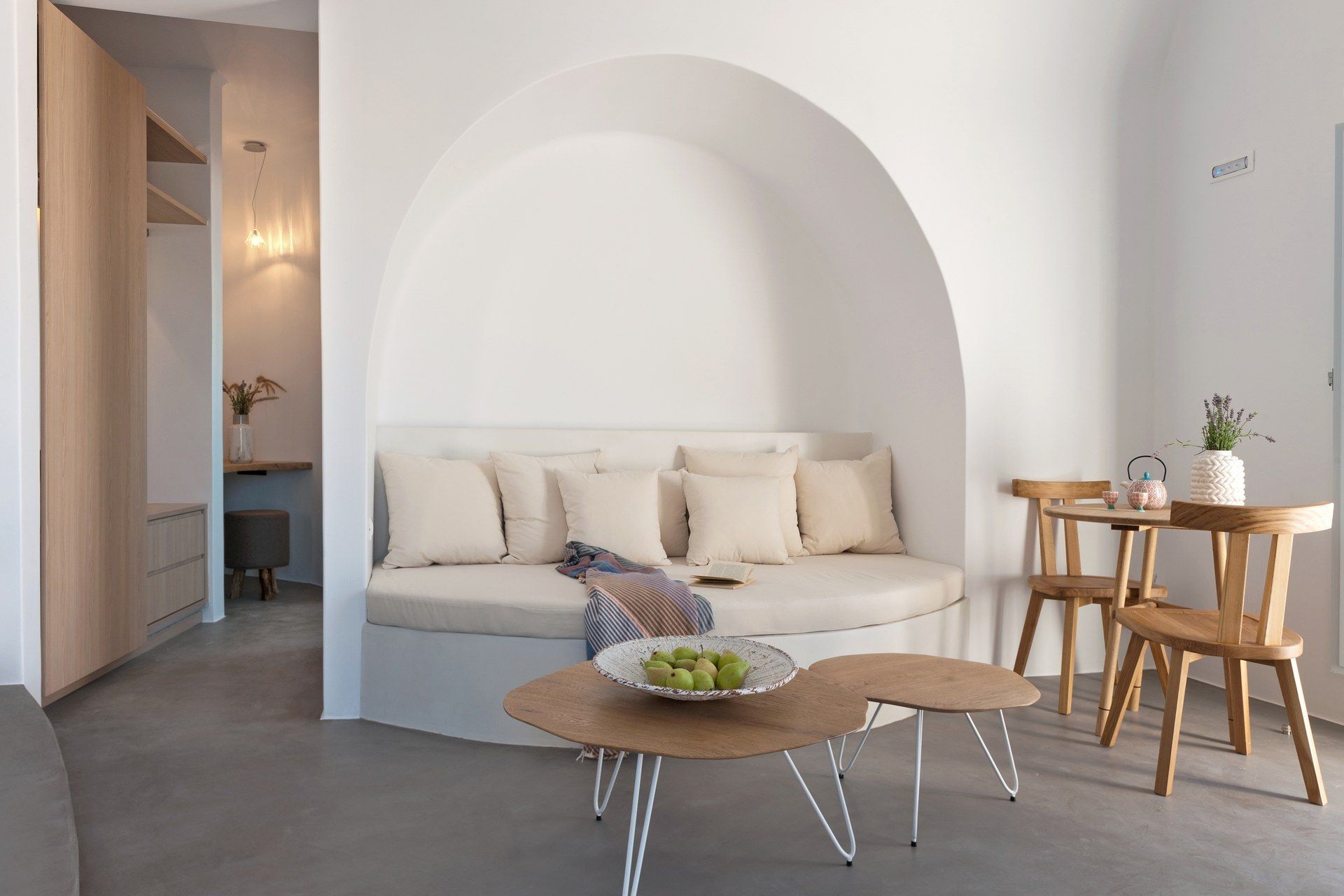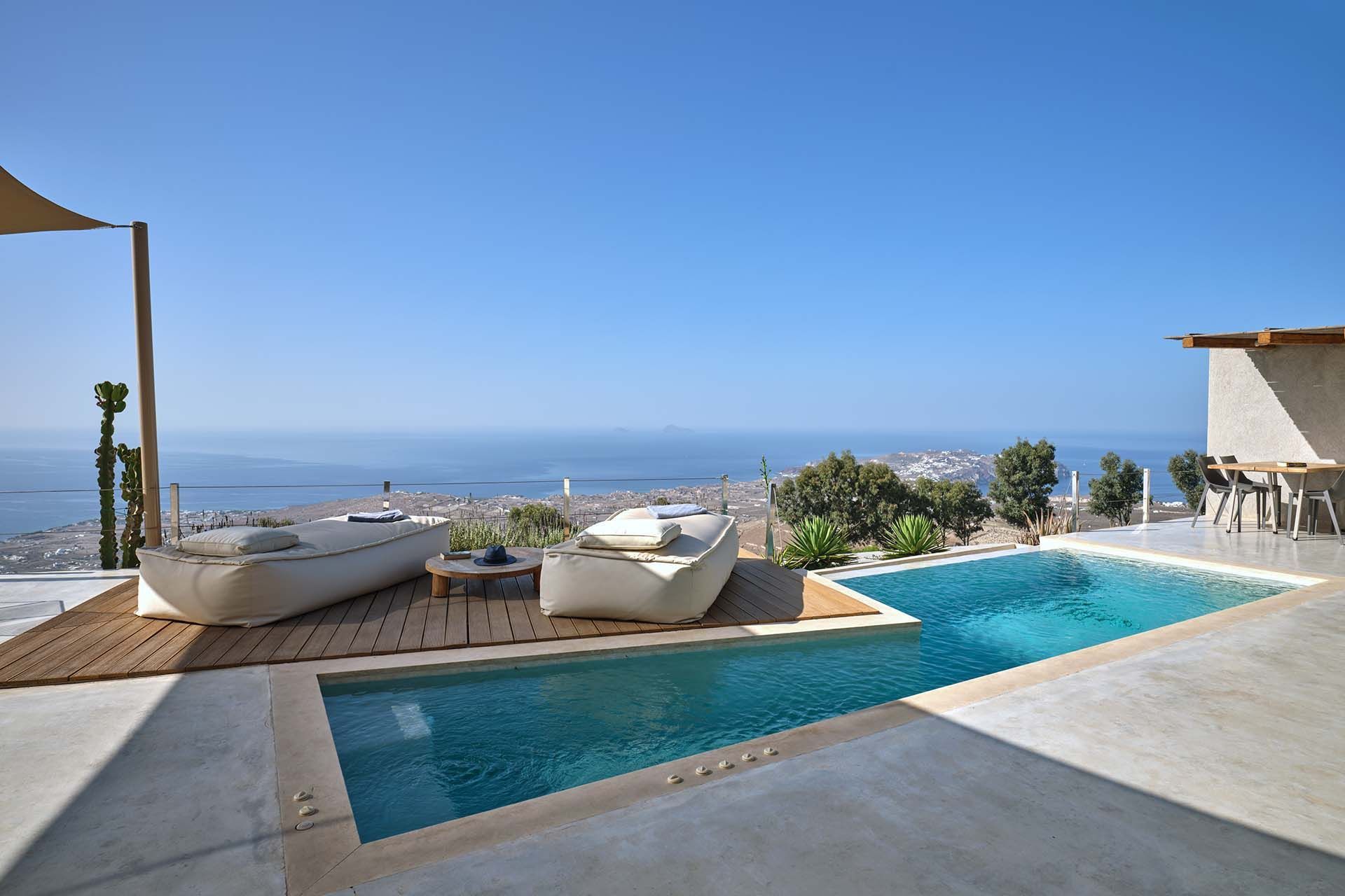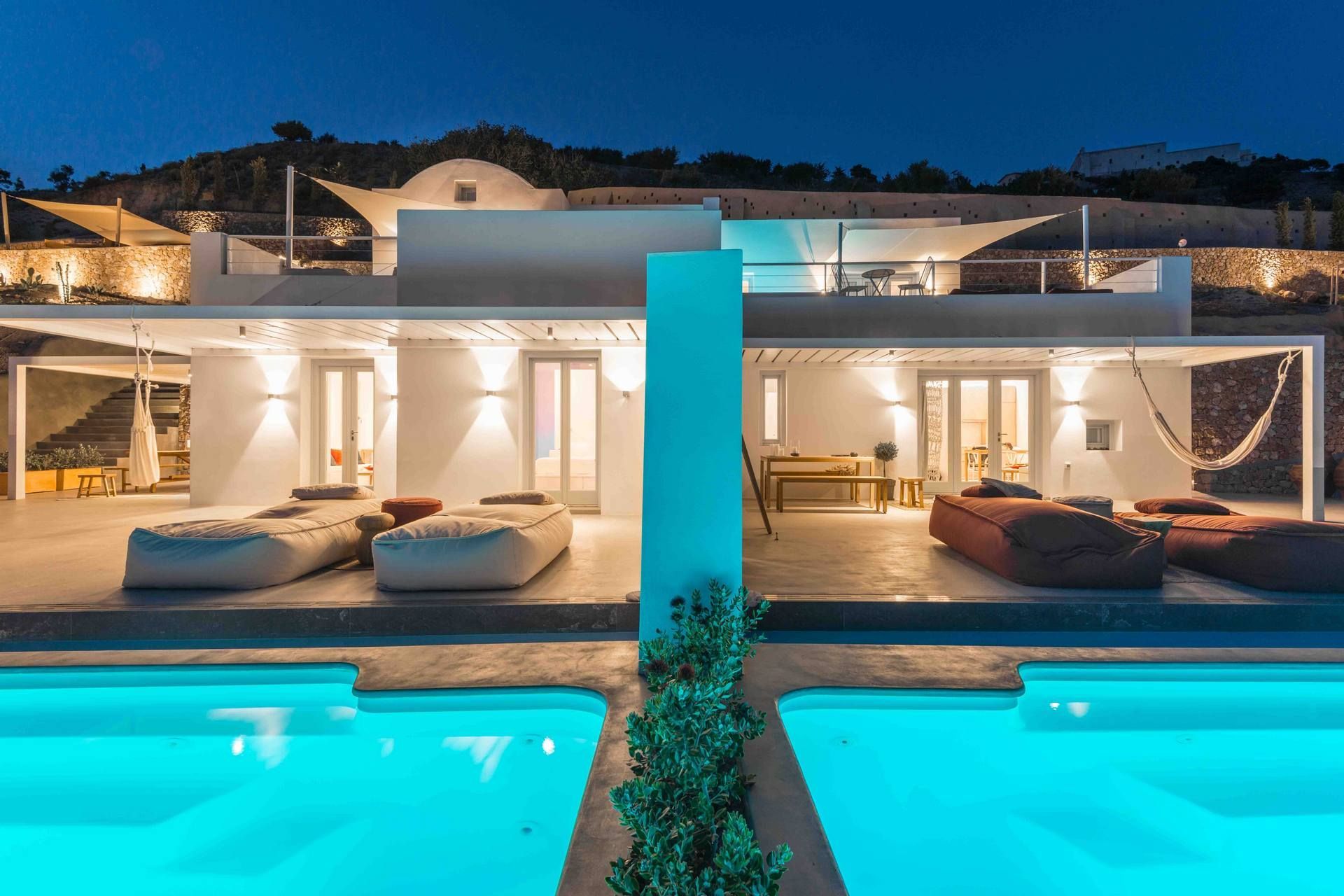 Satin is a Santorini villa for people who know that the island’s best luxury is space and ease. Set in Pyrgos Kallistis, it offers a private collection of living spaces—one main villa and a set of suites—designed for groups who want to travel together without surrendering independence. It hosts up to ten guests, plus five on sofa beds if needed, and keeps the tone modern and understated. The result feels quietly confident: a place to sleep well, eat well, swim often, and experience Santorini beyond the most crowded viewpoints.