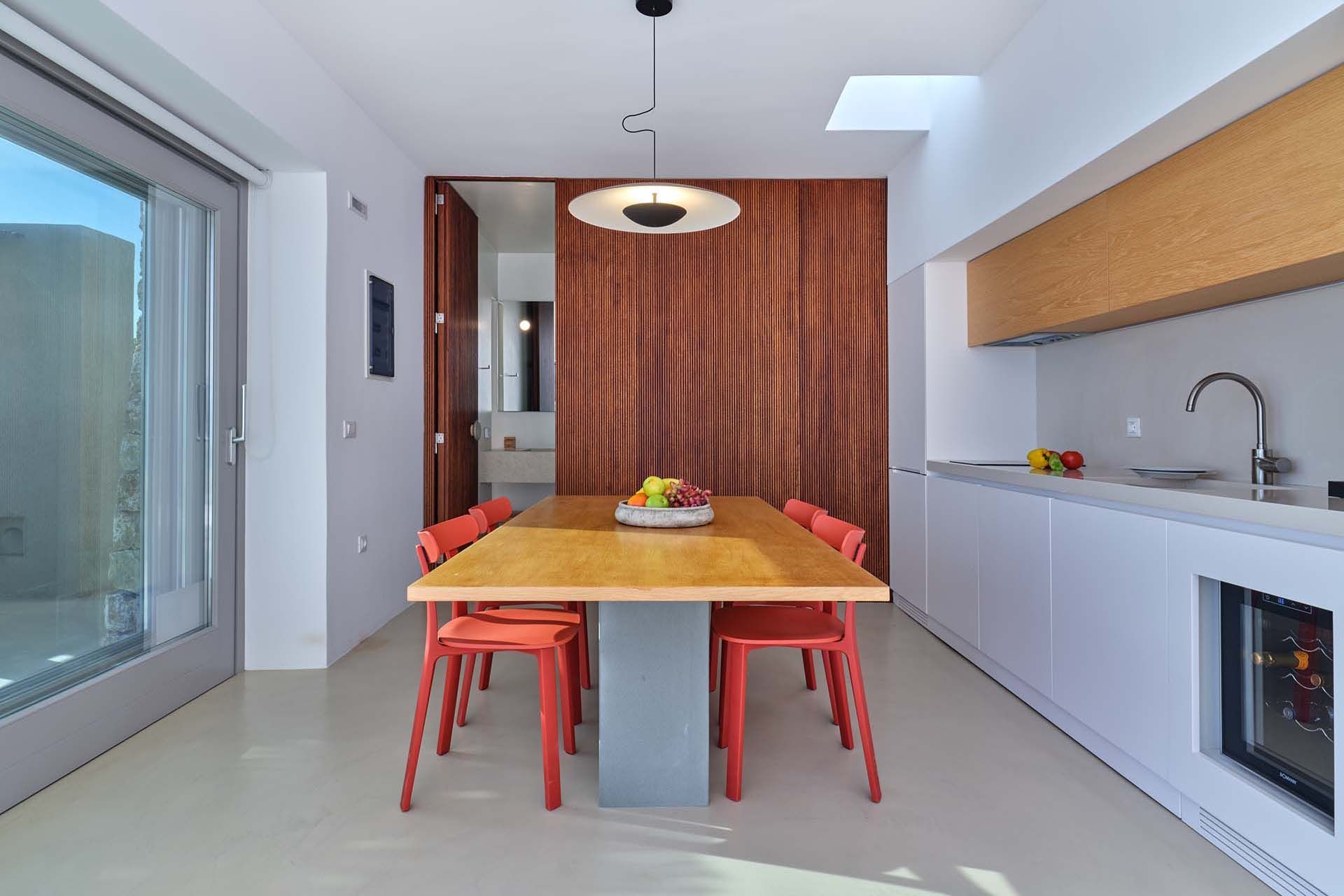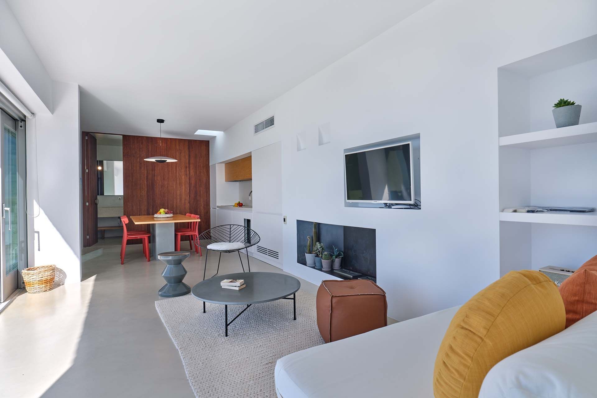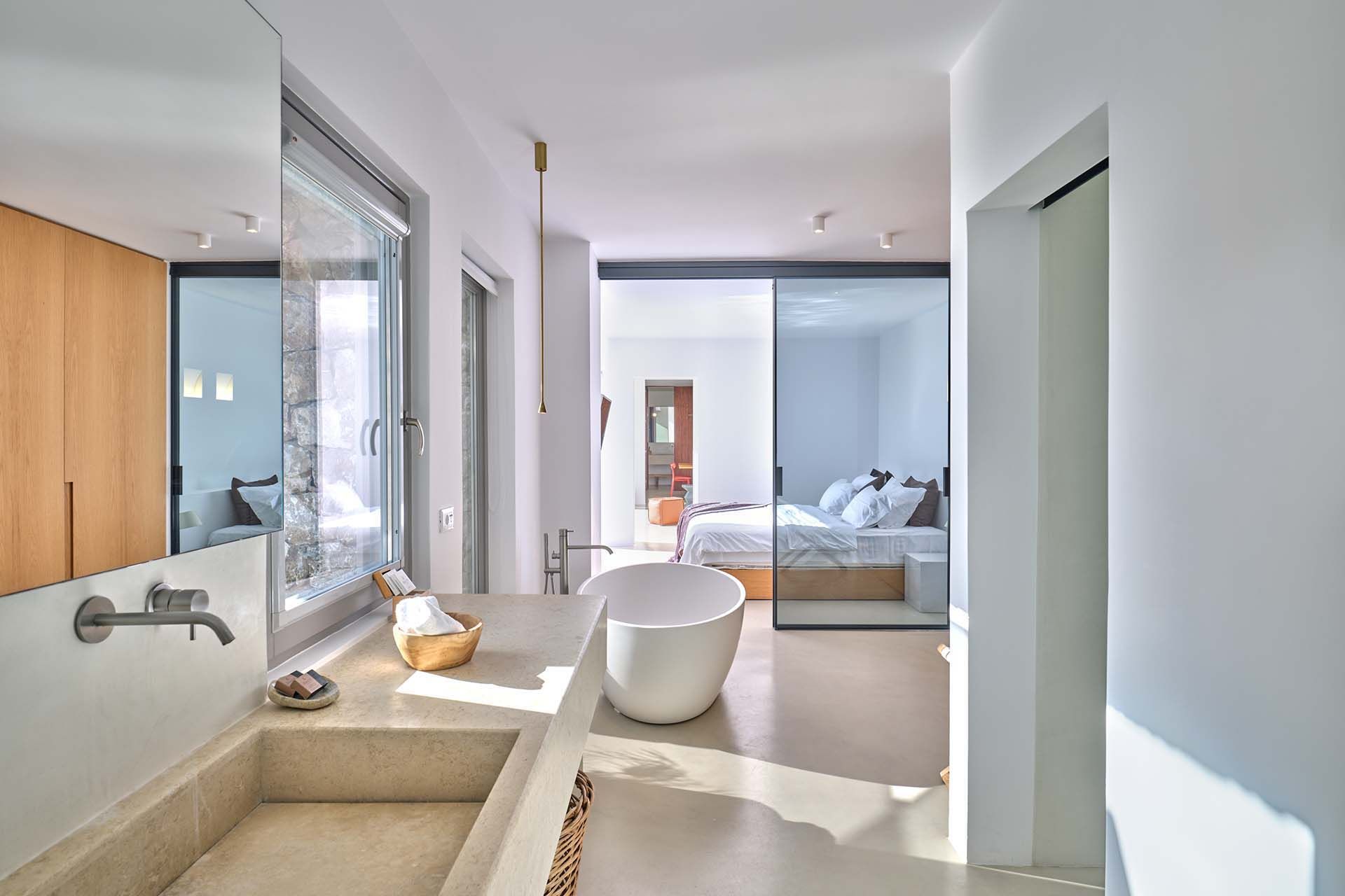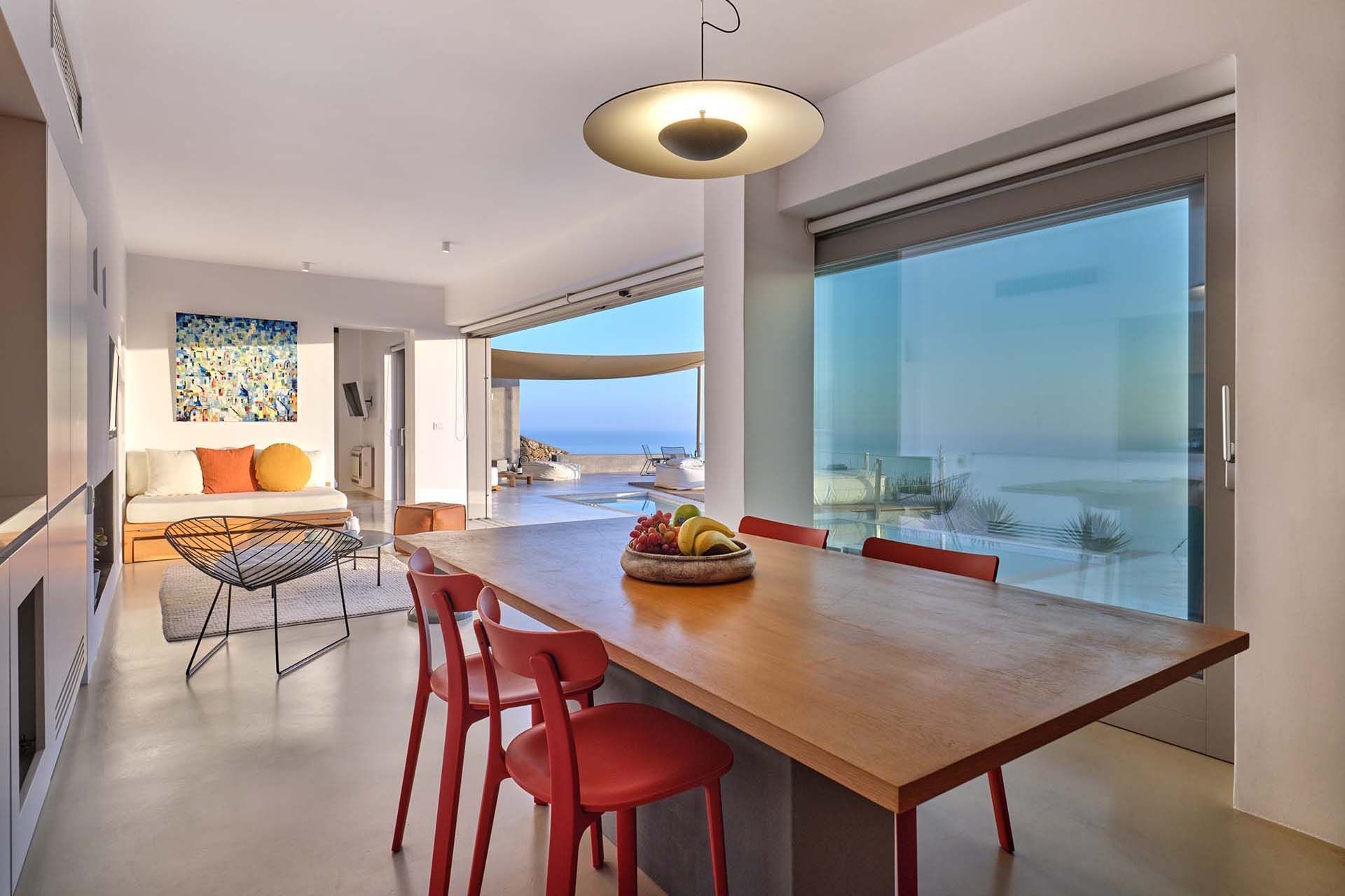 Inside, Satin is arranged with a practical understanding of group travel. The main villa offers a generous master bedroom and a comfortable living space, while each of the independent suites adds its own kitchenette, living area, and balcony—perfect for couples within a larger party. Comfort is treated seriously, from eco-friendly mattresses to hypoallergenic bedding and a pillow menu, so sleep and downtime are genuinely restorative. The interiors stay clean and modern, and the connection to the terraces keeps the home feeling open and bright.