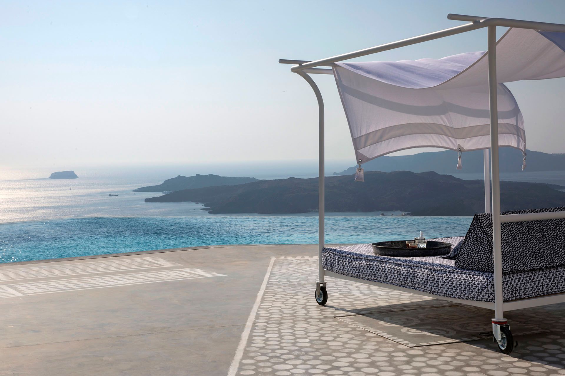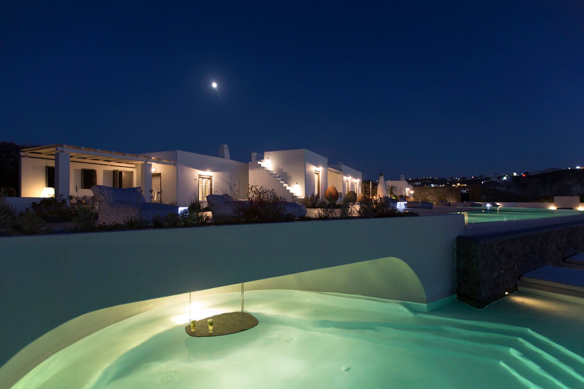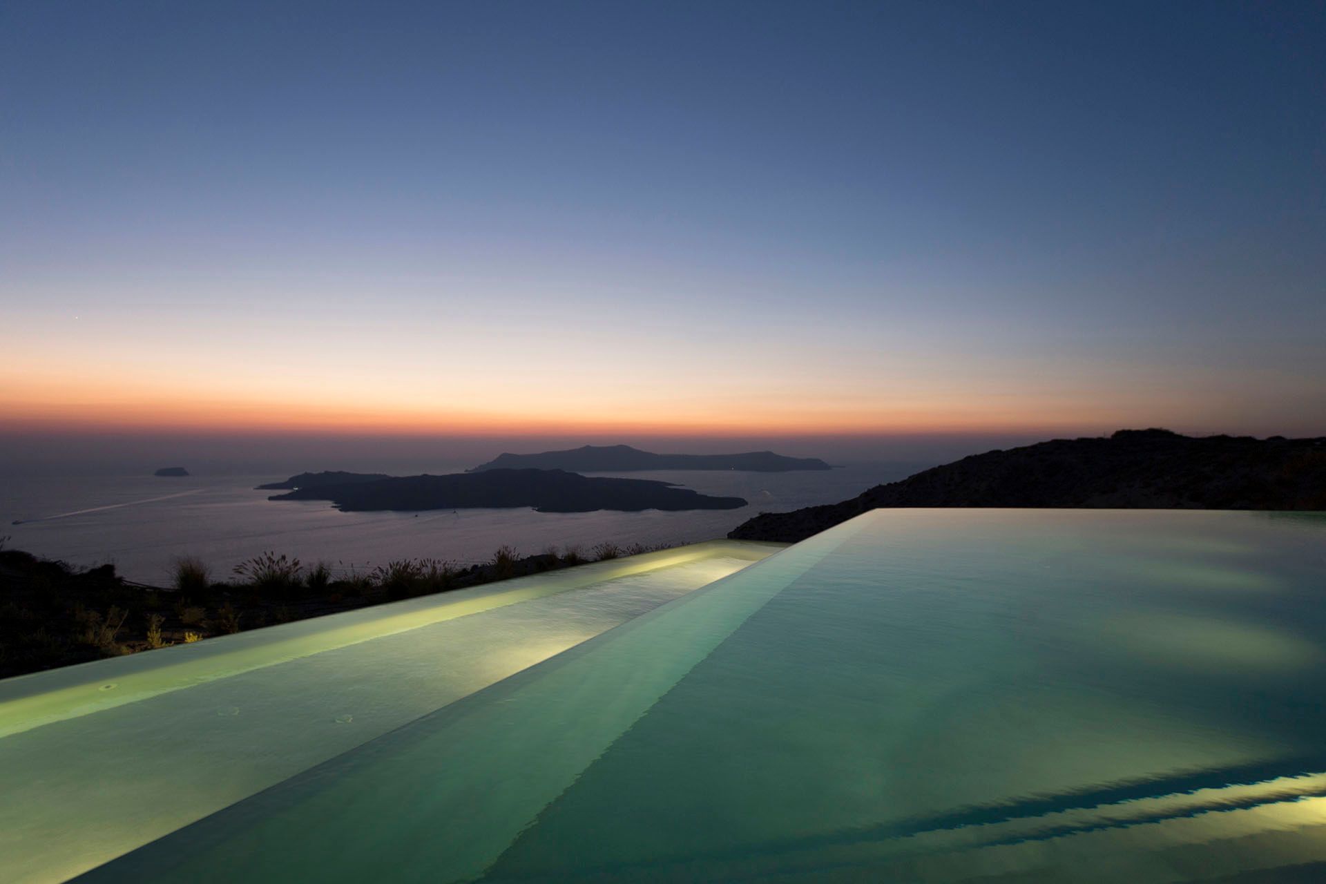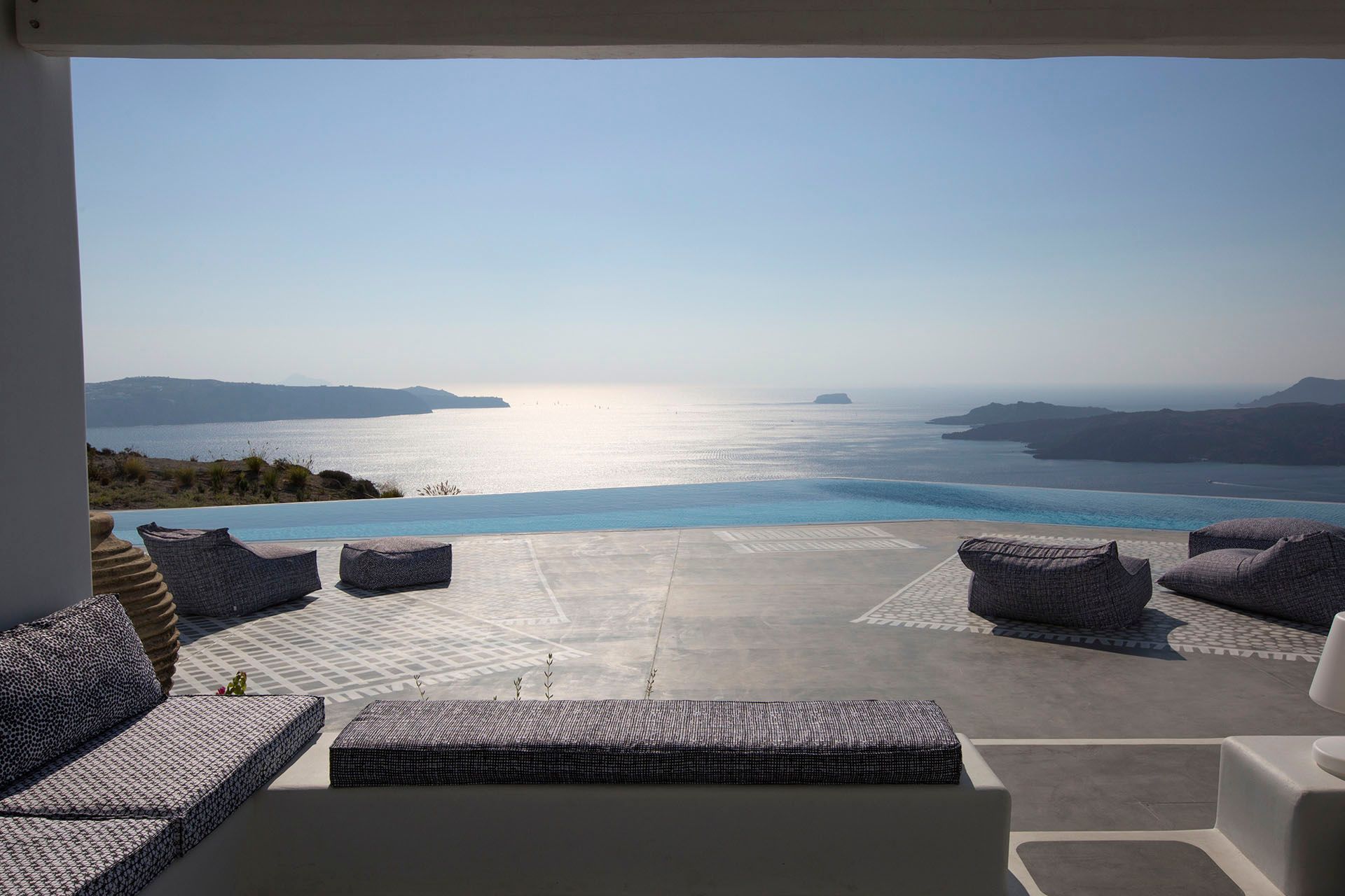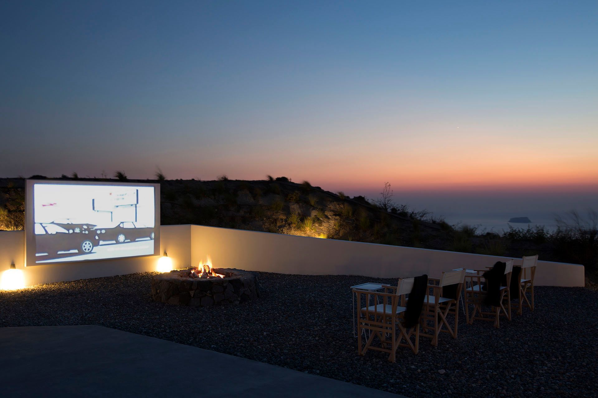 Dramatically positioned on the cliff edge, the outdoor area opens to wide 180-degree caldera views, with the multi-level designer infinity pool as the natural focal point. The pool cascades across three levels and includes underwater music—a detail that adds atmosphere without distracting from the setting. The terrace is arranged into distinct shared zones, including a pool bar, space for yoga and Pilates, a running path along the estate’s perimeter, an open-air cinema under the stars, and dedicated spa facilities. There is also a pool cave, serving as a shaded retreat for the hottest hours.