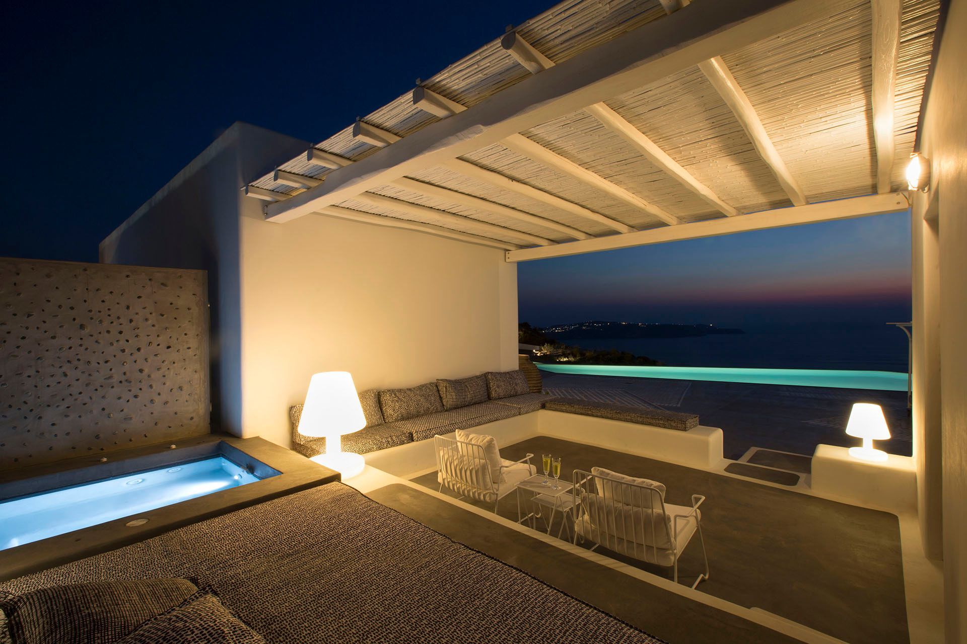 2-level suite open-plan with double size bed, A/C, bathroom with cave-style bathtub, hairdryer, safe box, closet, cozy restroom area, access to outdoor area with heated whirlpool, shower, shaded living area with caldera view, private roof-terrace with caldera view