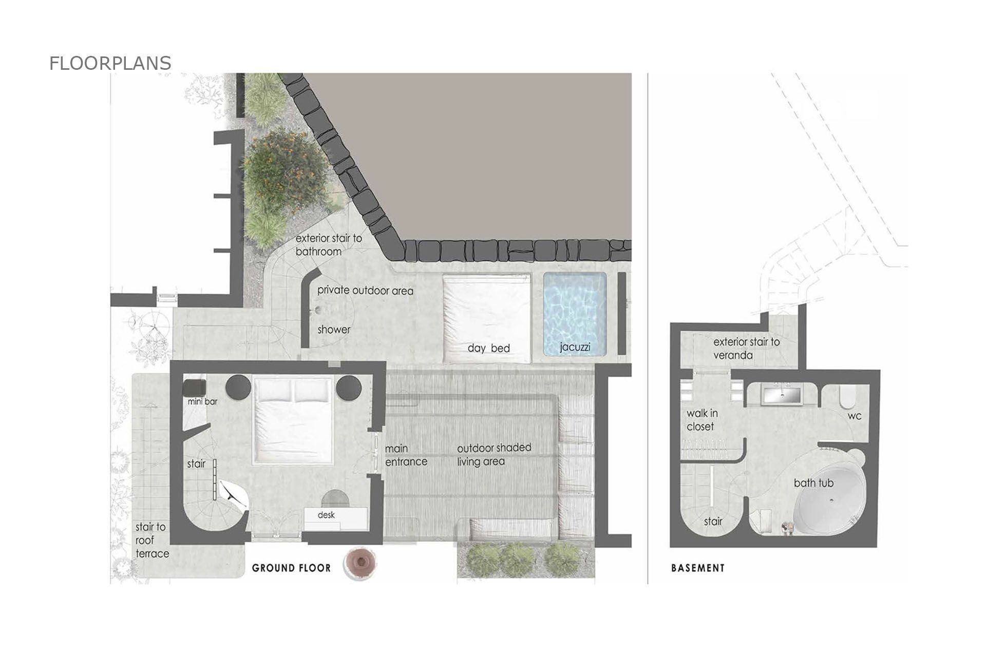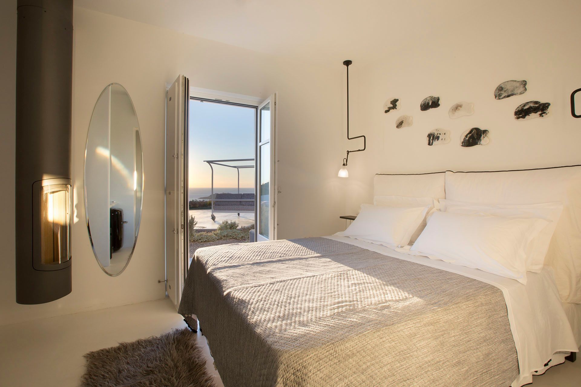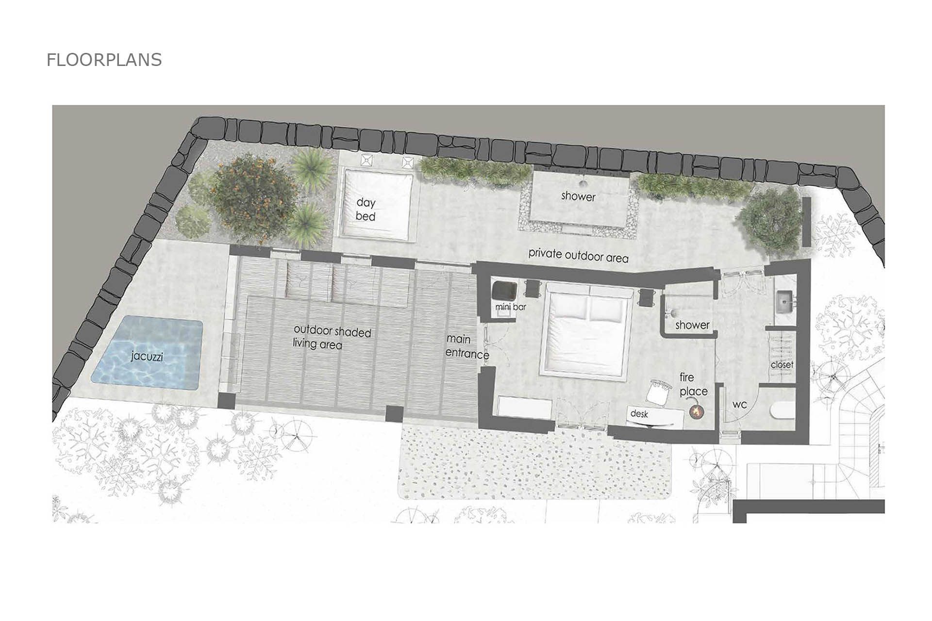 1 bedroom with double bed, A/C, en-suite bathroom with shower, hairdryer, safe box, closet, fireplace, access to private common backyard with daybeds & 7 sqm. outdoor heated pool (shared with suite 4), outdoor shaded living area with outdoor shower, caldera view