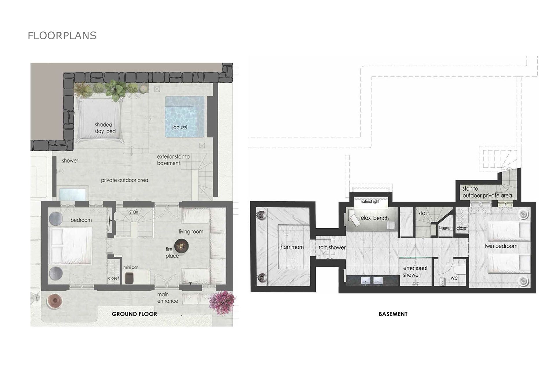 2-level suite open-plan with double size bed, A/C, en-suite bathroom with shower, hairdryer, safe box, closet, floating fireplace, massage & beauty treatment room, hammam, heated relax bed, access to outdoor area with heated whirlpool, shower, private backyard with daybed, sea view