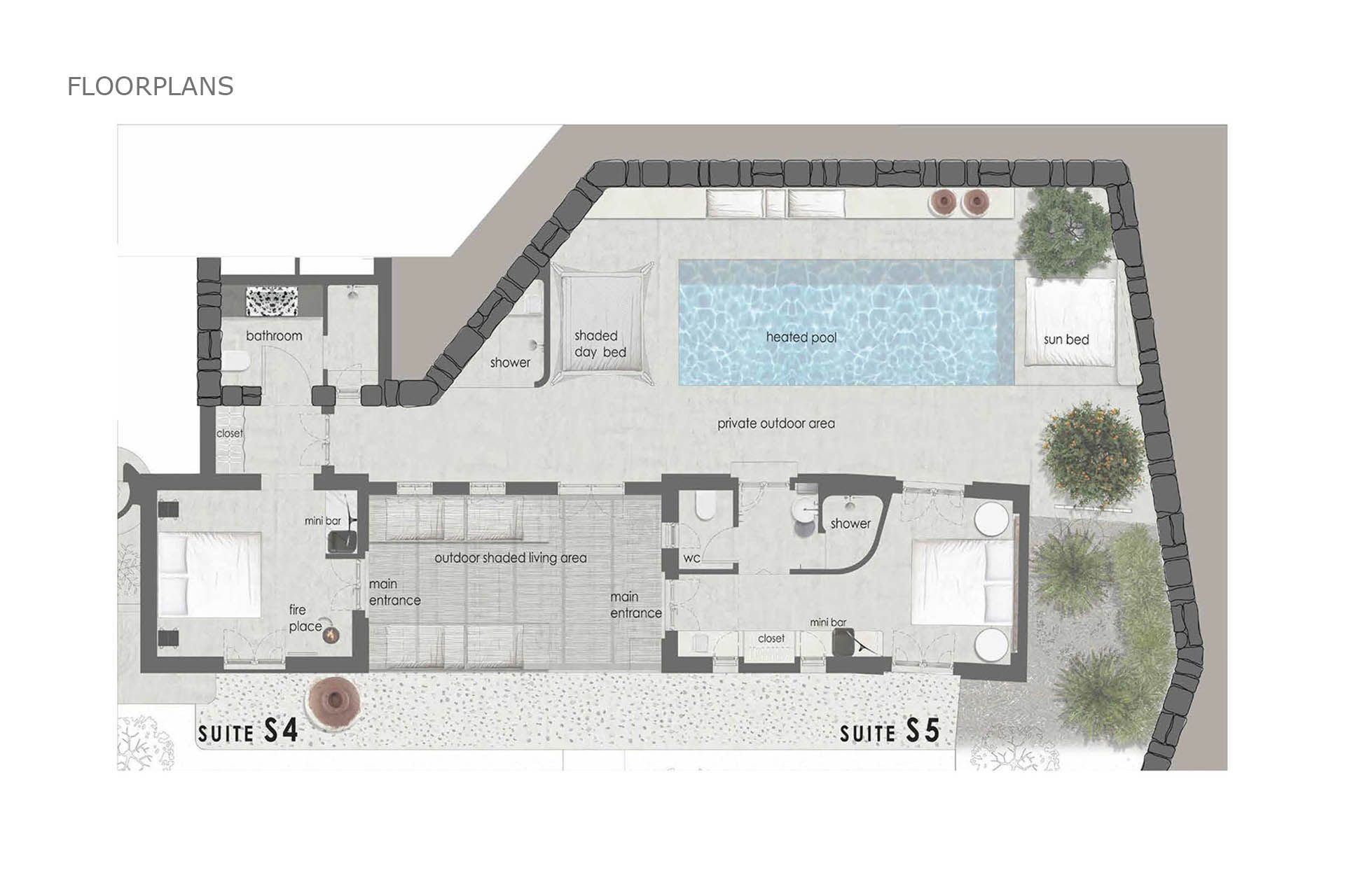 1 bedroom with a double bed (can be converted into twin beds), A/C, en-suite bathroom with shower, hairdryer, safe box, closet, baby cot, floating fireplace, access to private backyard with daybeds, 7 sqm. outdoor heated pool (shared with suite 5), outdoor shaded living area with outdoor shower, caldera view