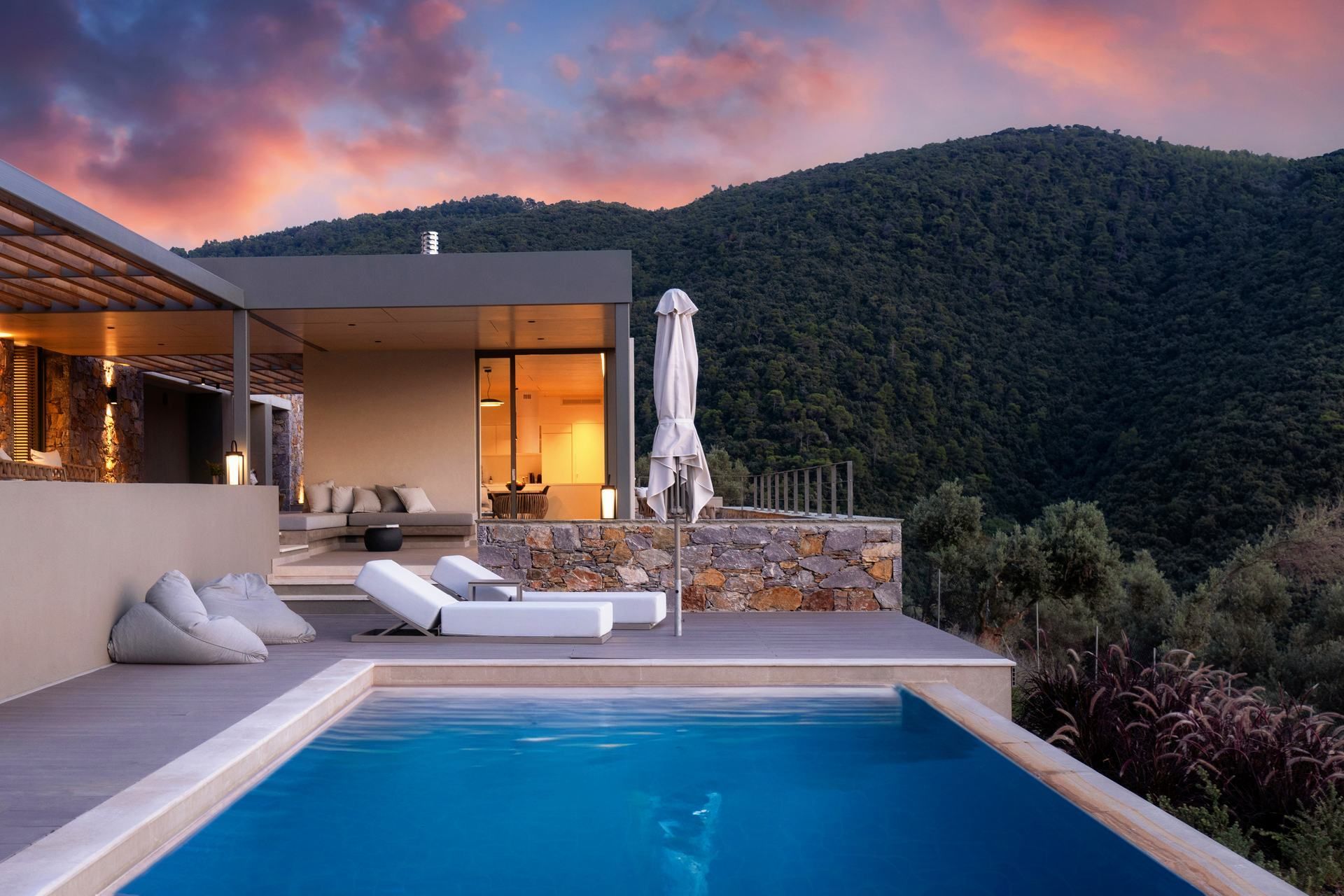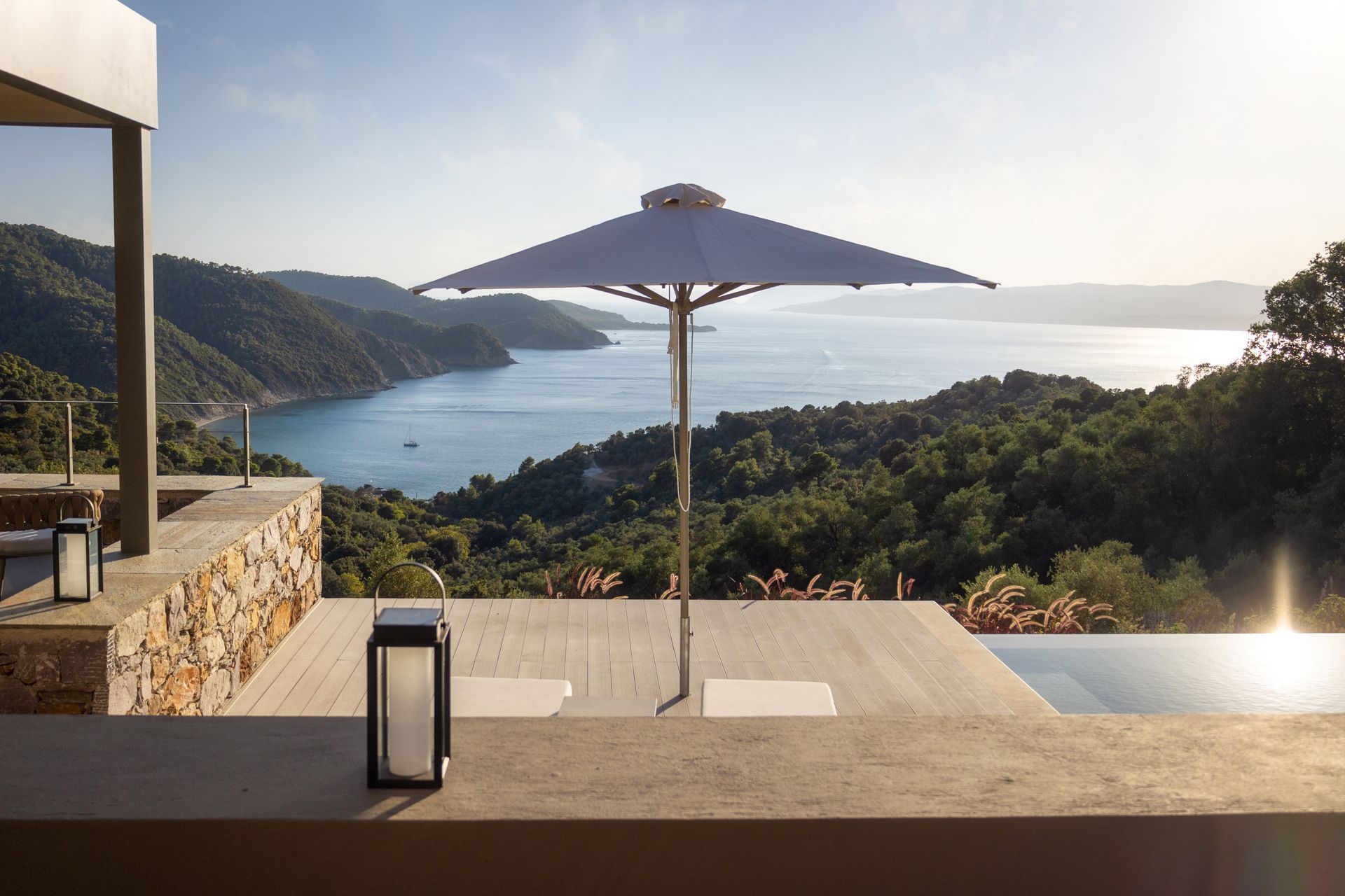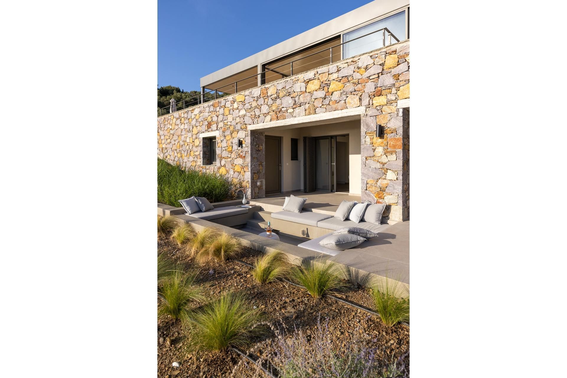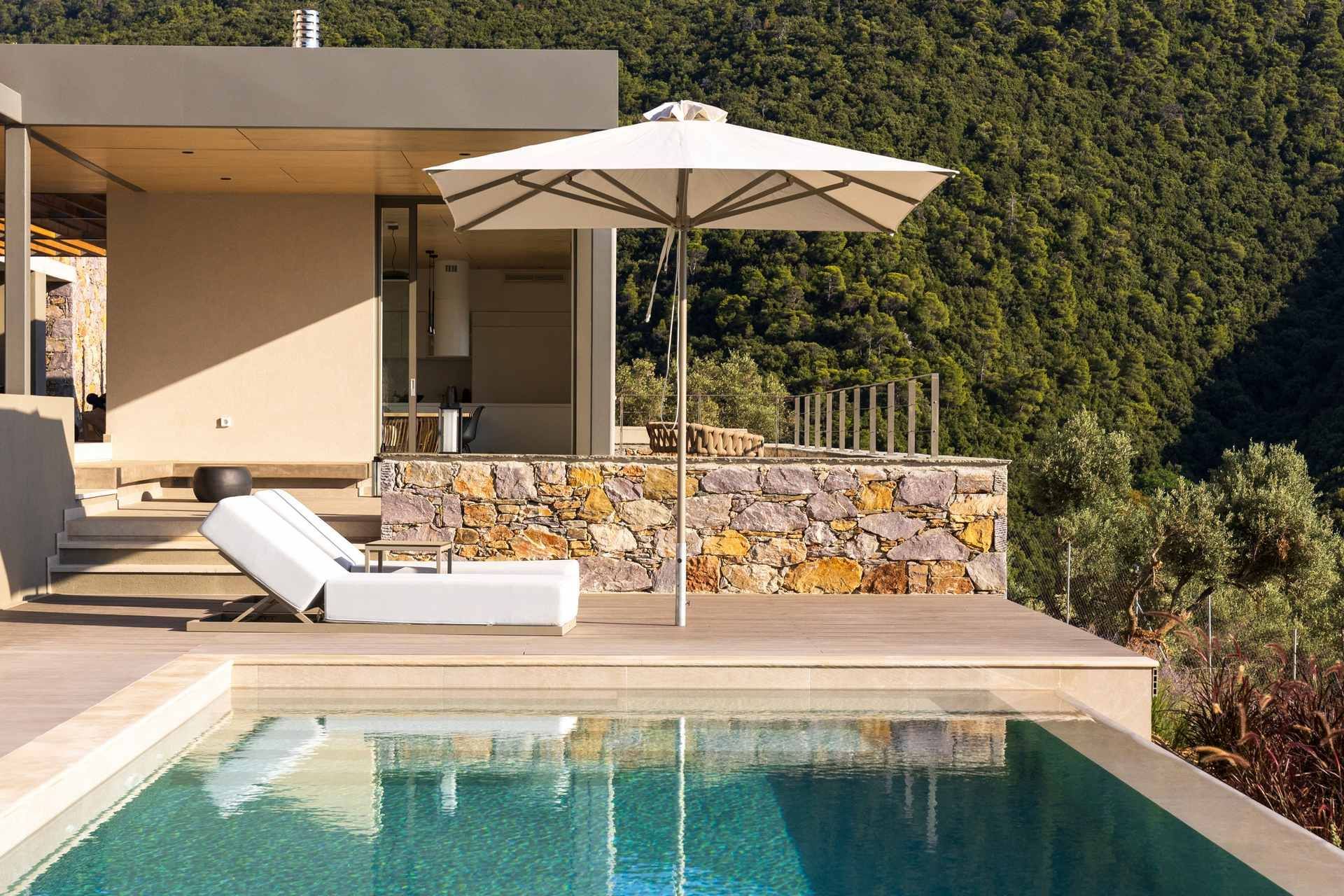 This luxury villa in Skiathos has a quieter, greener feel, with pine and olive trees all around and the sea stretching out ahead. Kechria and Ligaries beaches are a short drive away, and when you want a livelier scene, Skiathos Town is close enough for restaurants, bars, and a little nightlife. Options here are endless, but you’ll find that most evenings tend to end on the terrace, watching the sunset settle over the water.