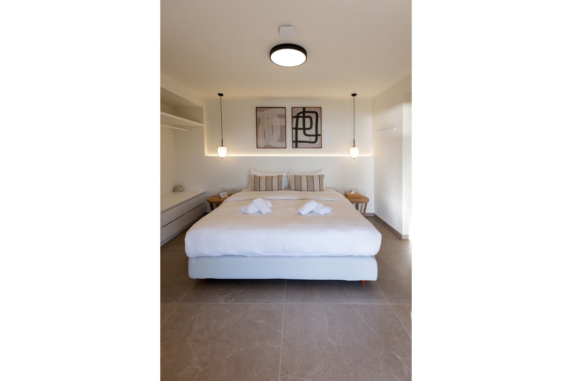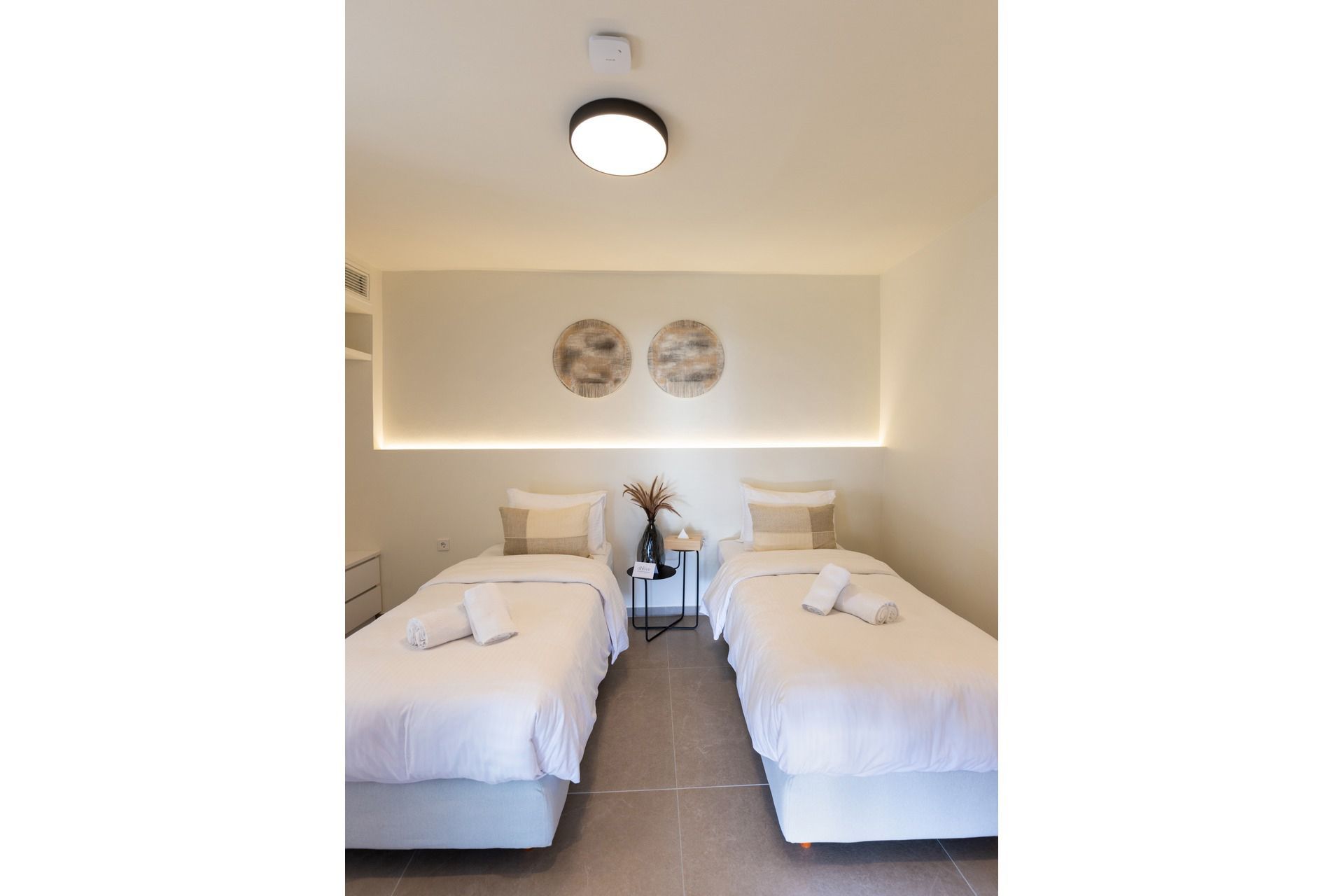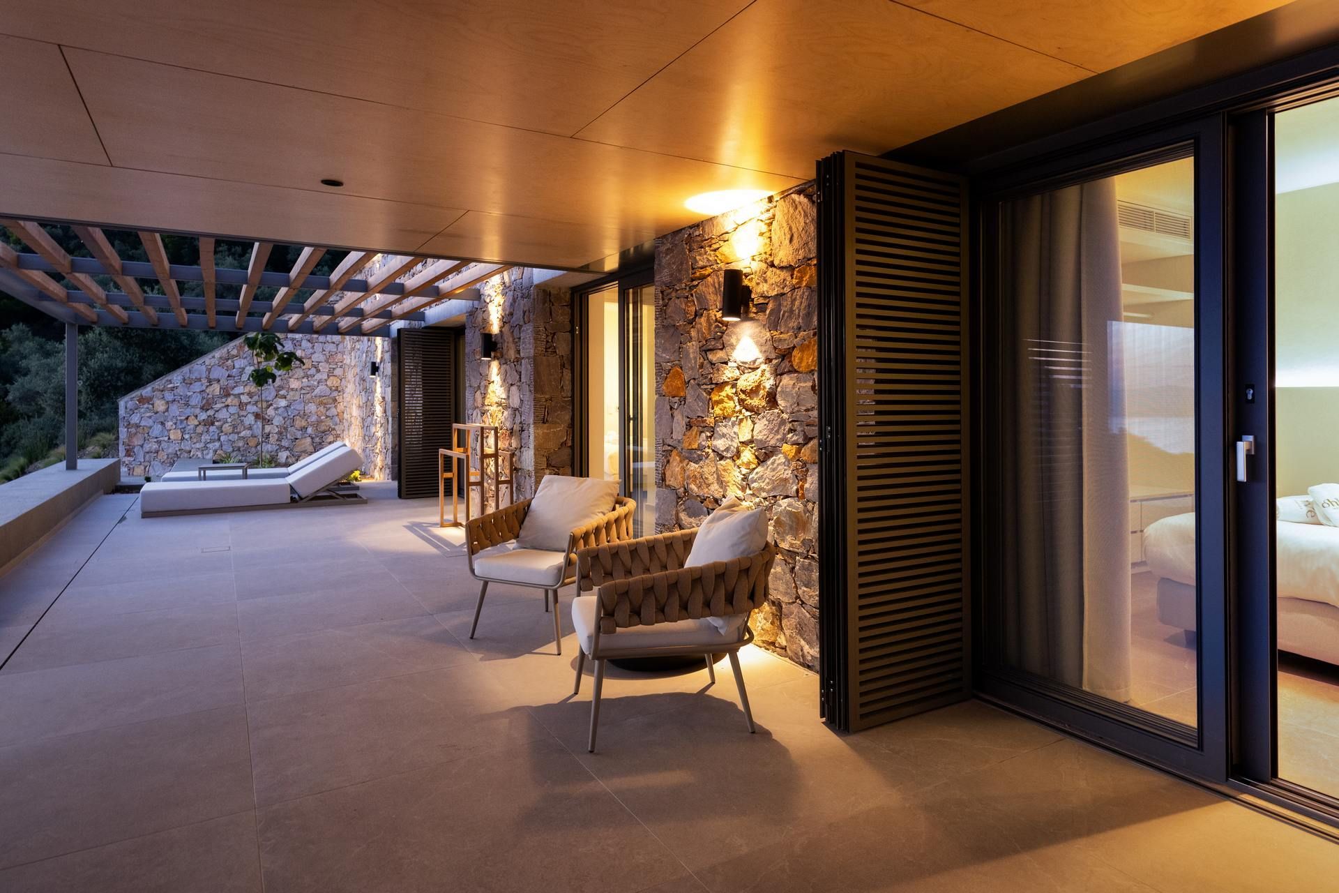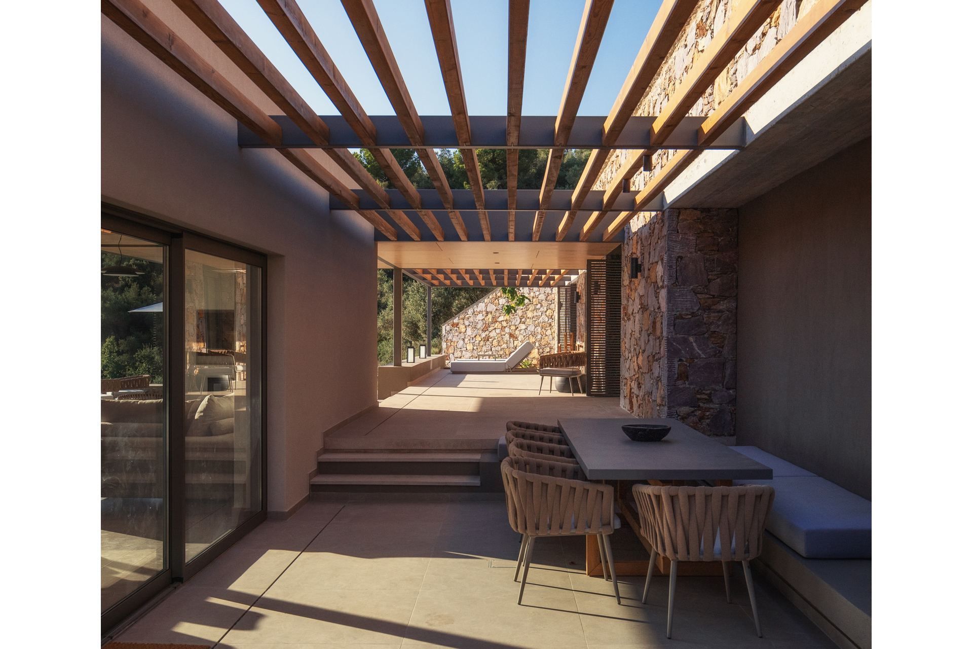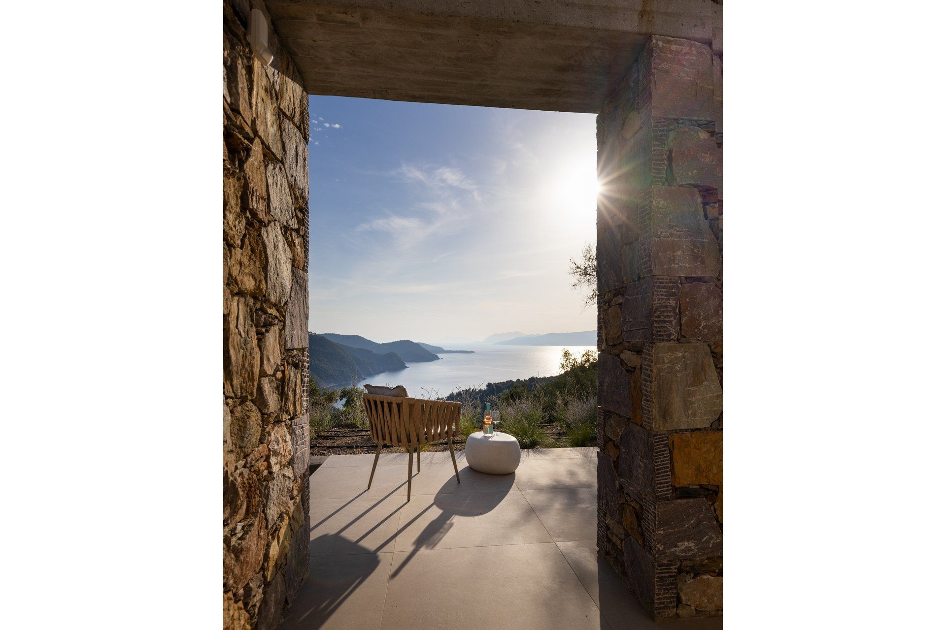 Villa Acanthus offers a quieter Skiathos experience, among pines, olives and the Aegean always in view. It sleeps eight guests in four ensuite bedrooms over two levels, arranged as two connected bedroom pairs that suit families travelling with children or friends who like a little closeness without giving up privacy. The design is clean and unforced, with spaces that feel intentionally simple, letting the landscape, the sea, and the light become the main features.