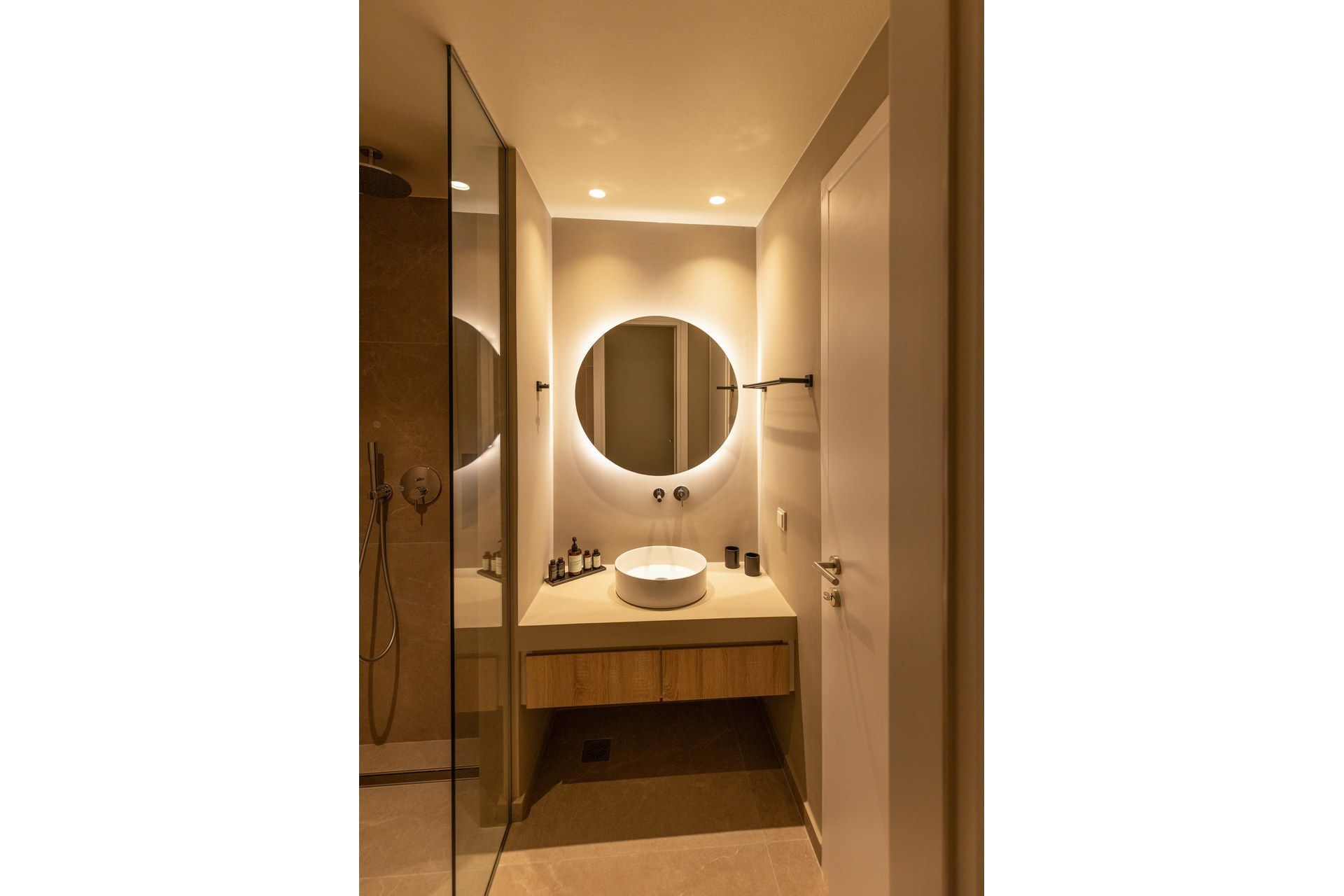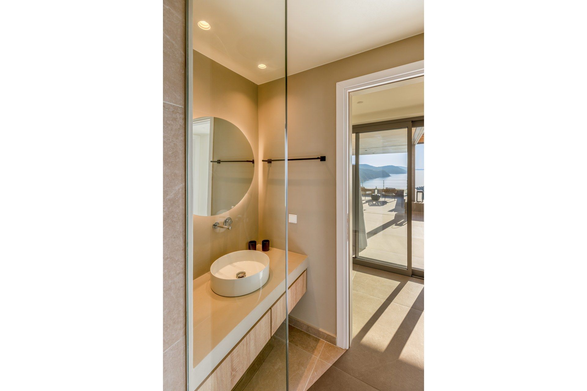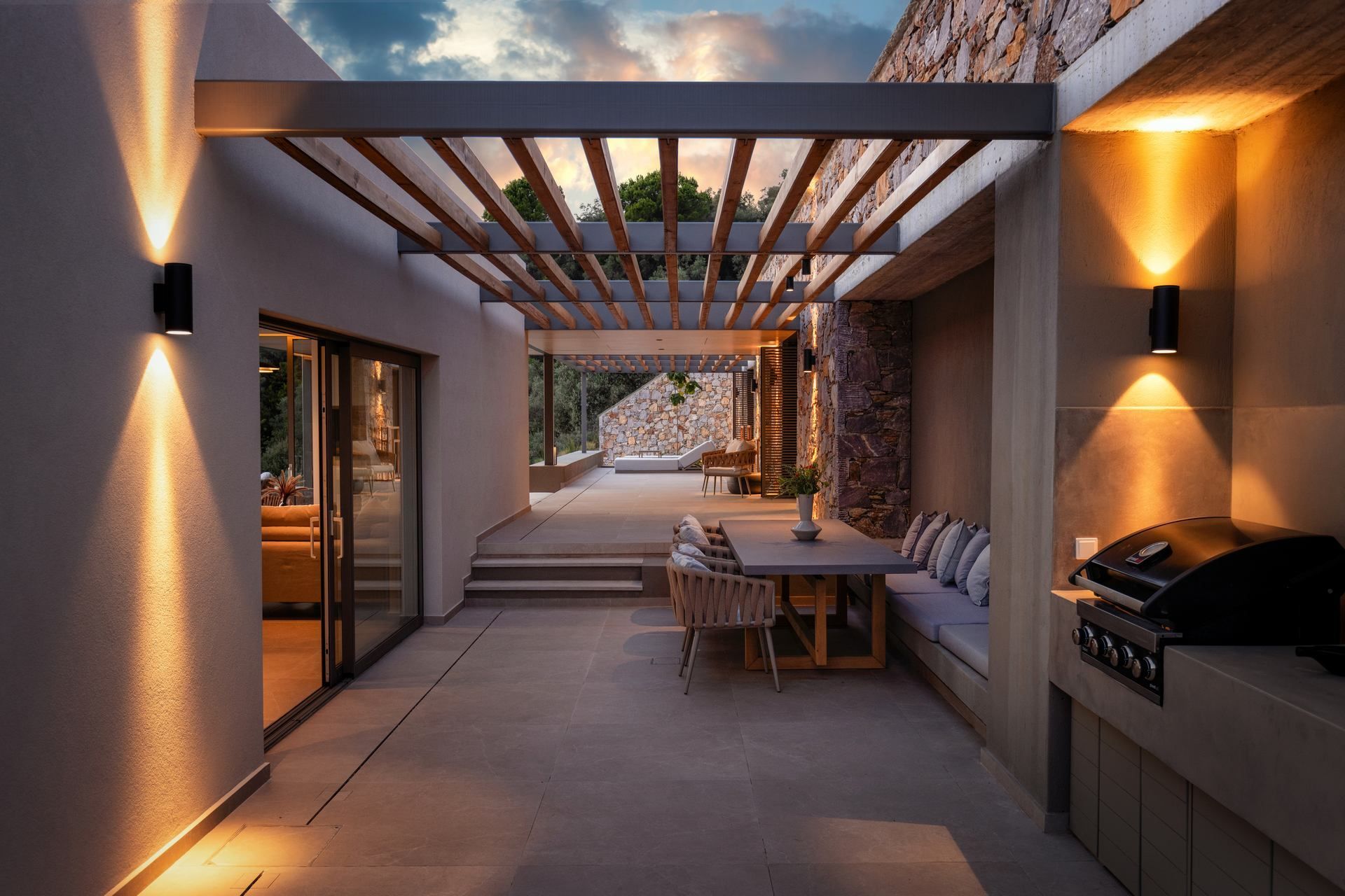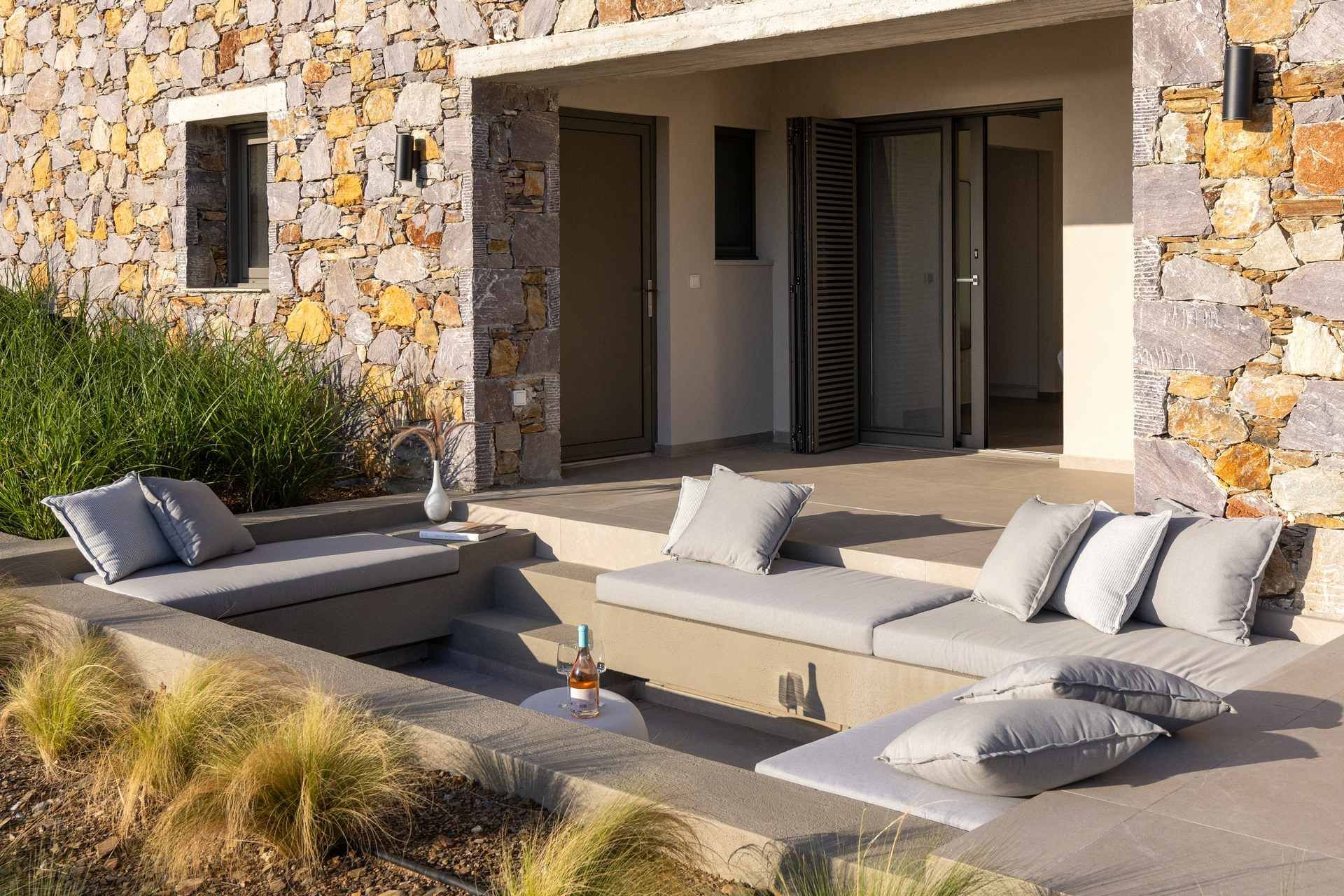 Outdoor living is the villa’s highlight, with a 34 sqm infinity pool that holds the horizon in front of you and sets the pace for the day. The terrace includes loungers, umbrellas, and relaxed dining and lounge corners that work from morning coffee through late evening. A gas BBQ keeps dinners easy, and the outdoor shower makes sandy returns feel effortless. The garden adds a soft green edge, and the parking area for two cars keeps day trips and late dinners in town uncomplicated.