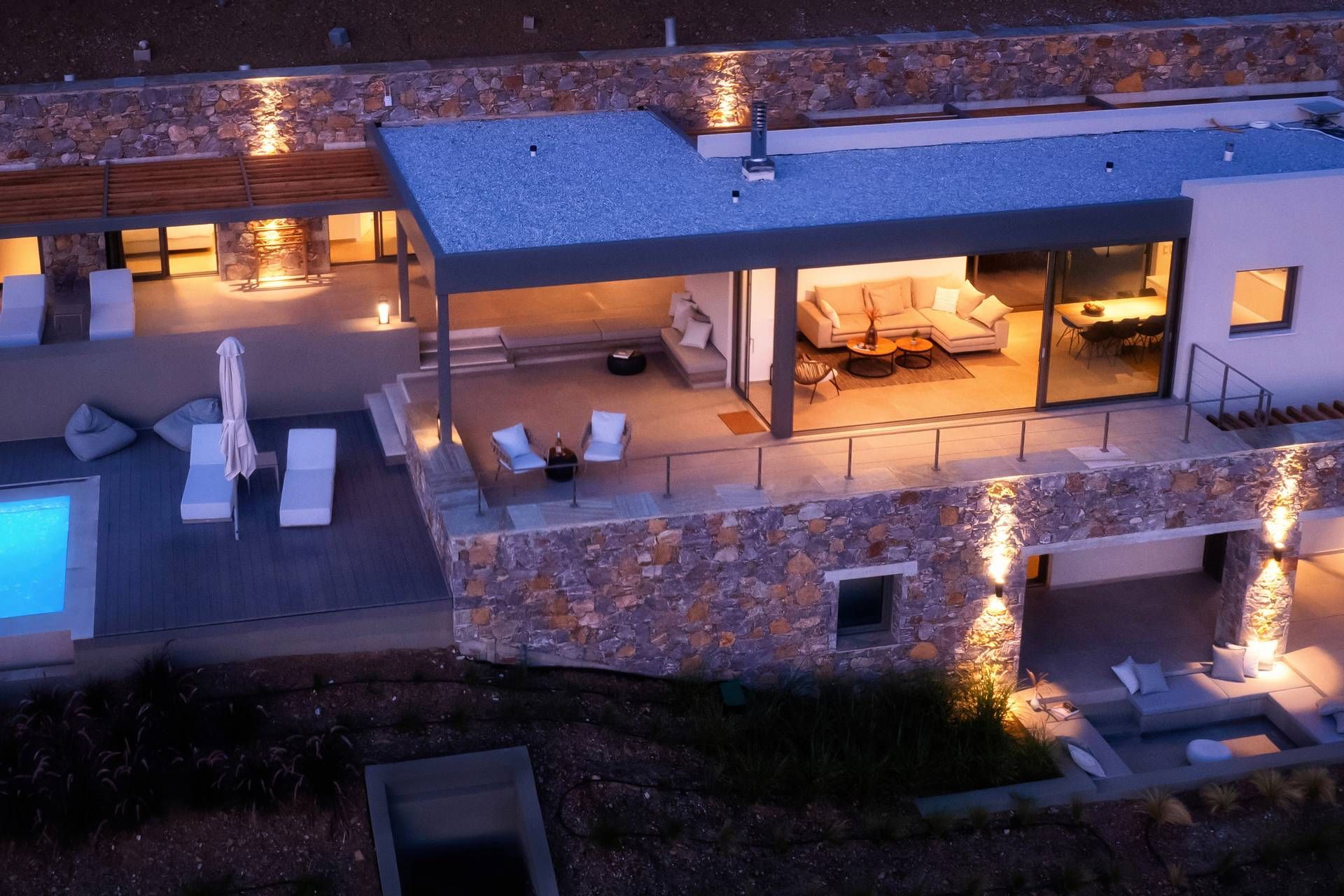 Indoors, the house is designed around flow. The living room, dining area, and fully equipped kitchen sit on the ground level with sea views and direct access to the pool terrace, making the villa feel open and social. Two bedrooms on this level—a master double and a twin junior—are connected internally and both ensuite, ideal for parents and children. Downstairs, the second pair mirrors the same arrangement, giving you a balanced layout for two families or a group that wants a clear sense of zones.