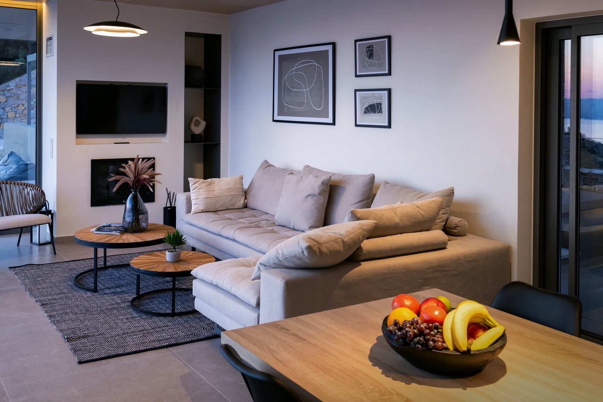Living area with TV, fireplace, access to pool terrace, sea view