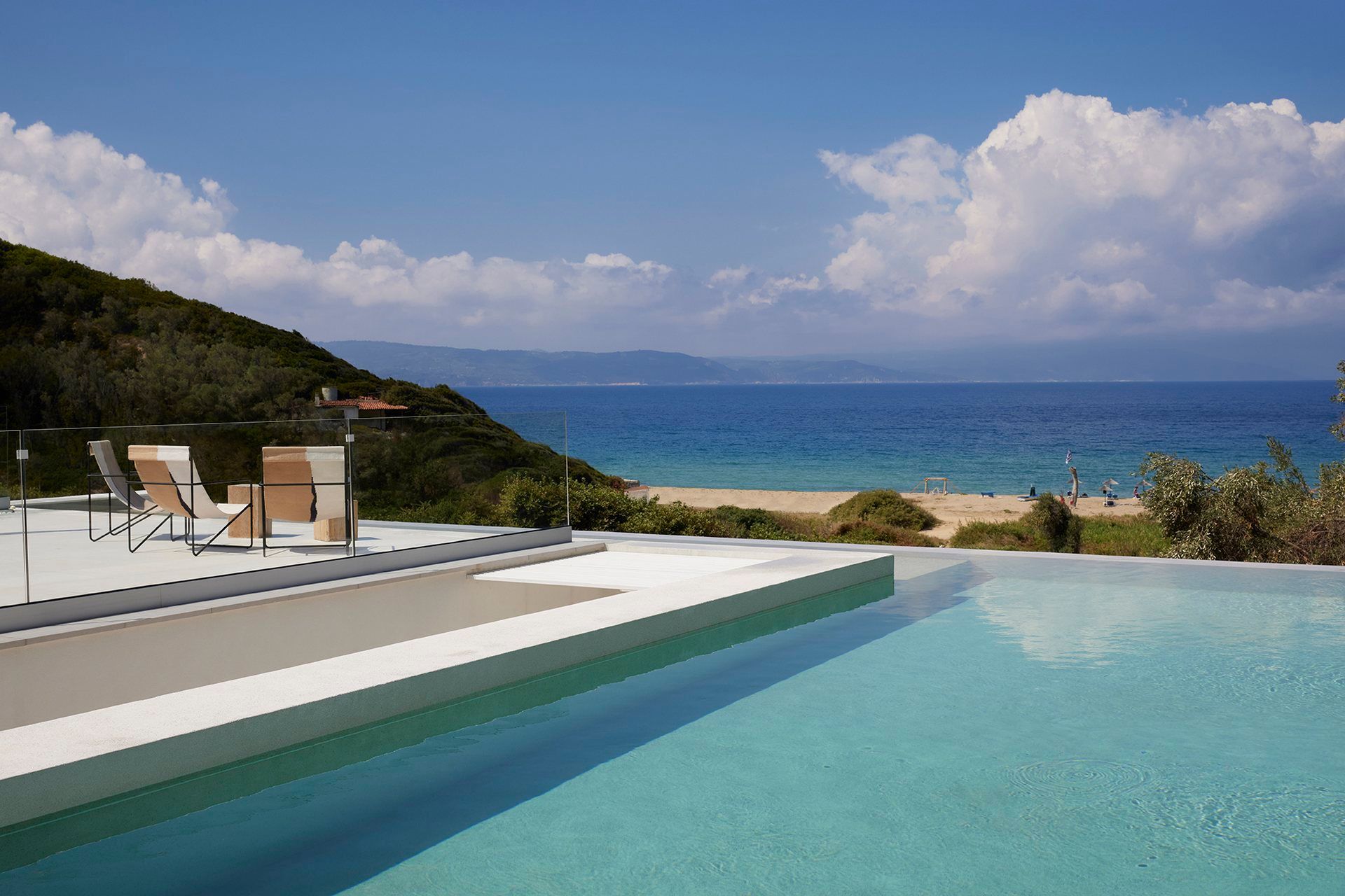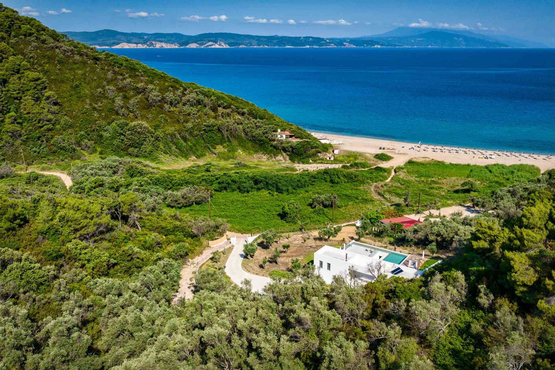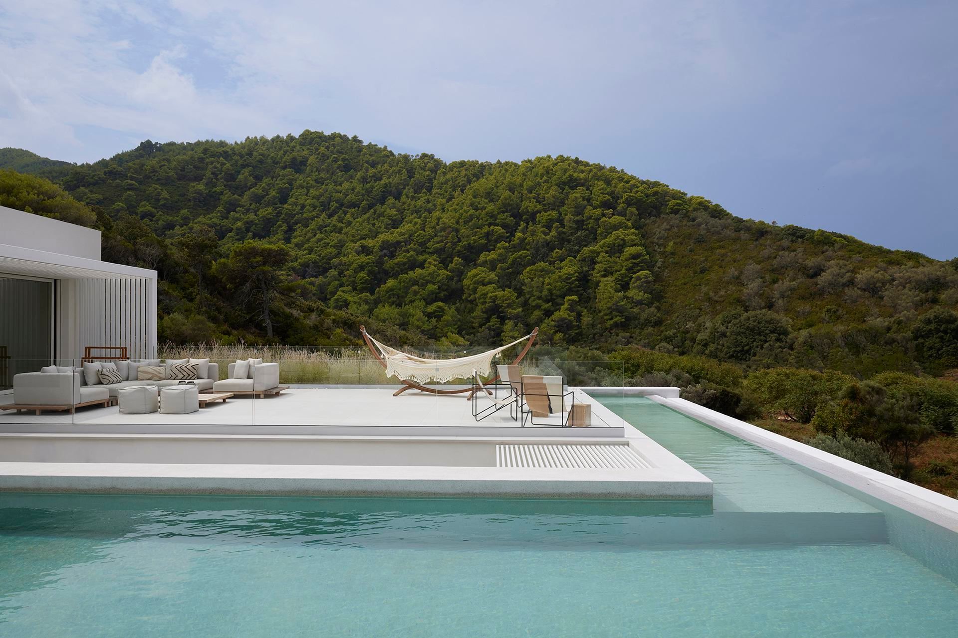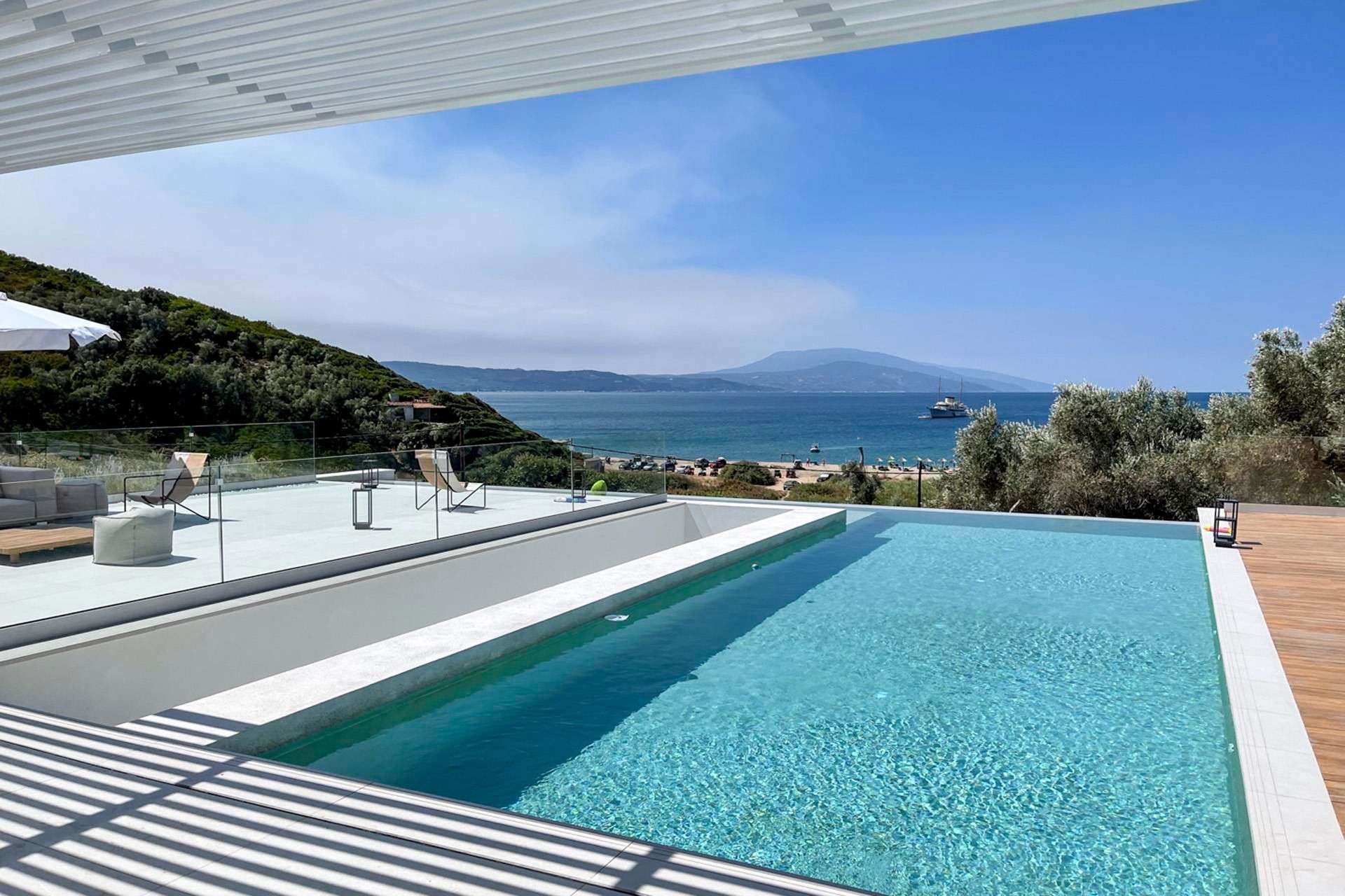Azurine sits near sandy Ligaries Beach in Skiathos, in a setting that feels green and protected yet wonderfully open to the sea. This luxury villa accommodates up to eight guests in four bedrooms and four bathrooms, with the shared living spaces on the pool level and the bedrooms positioned below for privacy and quieter mornings. The design is modern and understated, made for guests who want beach days on foot, a serious pool at home, and a calm base that still feels special.