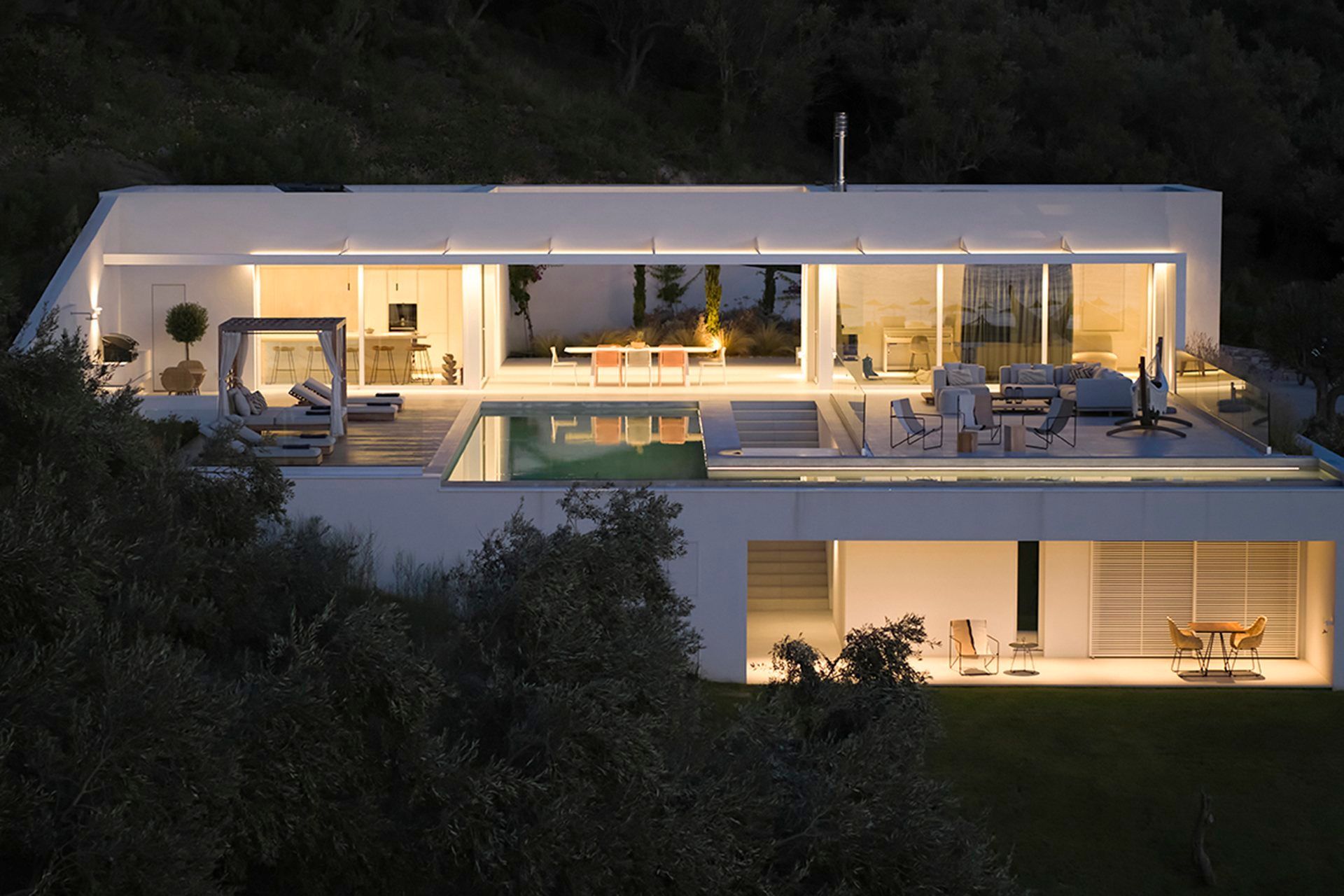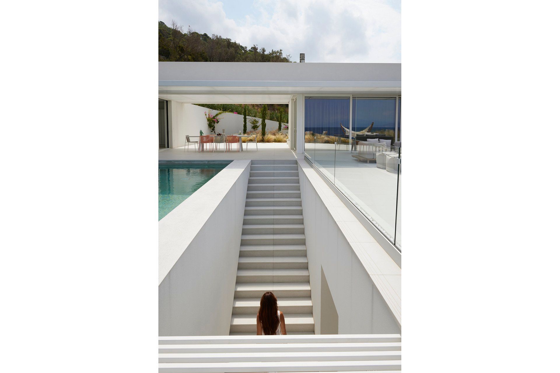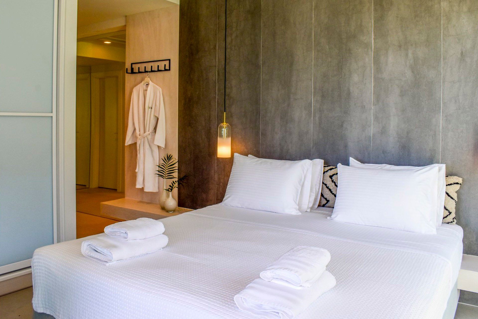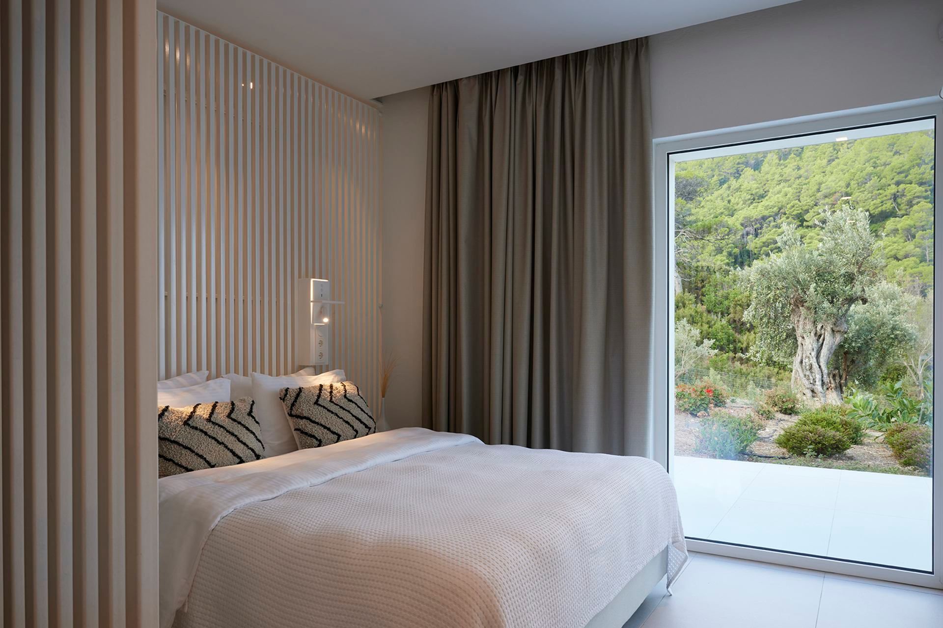Indoors, the pool level is designed to feel open and easy, with a sea-view living room with TV and fireplace, a dining area for eight, and a fully equipped kitchen. Large openings connect the interior to the pool terrace, so the line between inside and out stays blurred in the best way. On the lower level, bedrooms open to the garden, everything is air-conditioned, and the layout works especially well for families or friends travelling together.