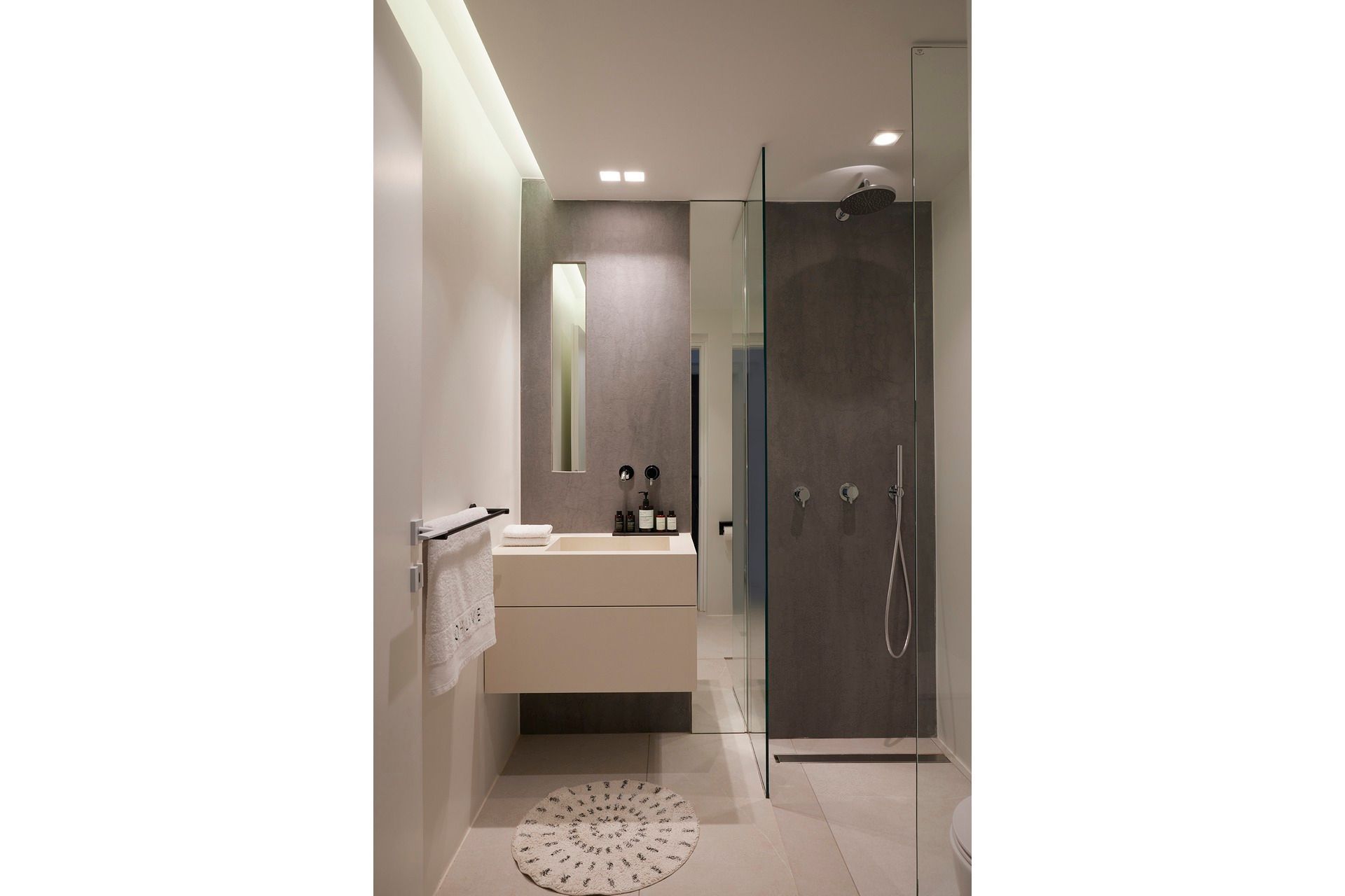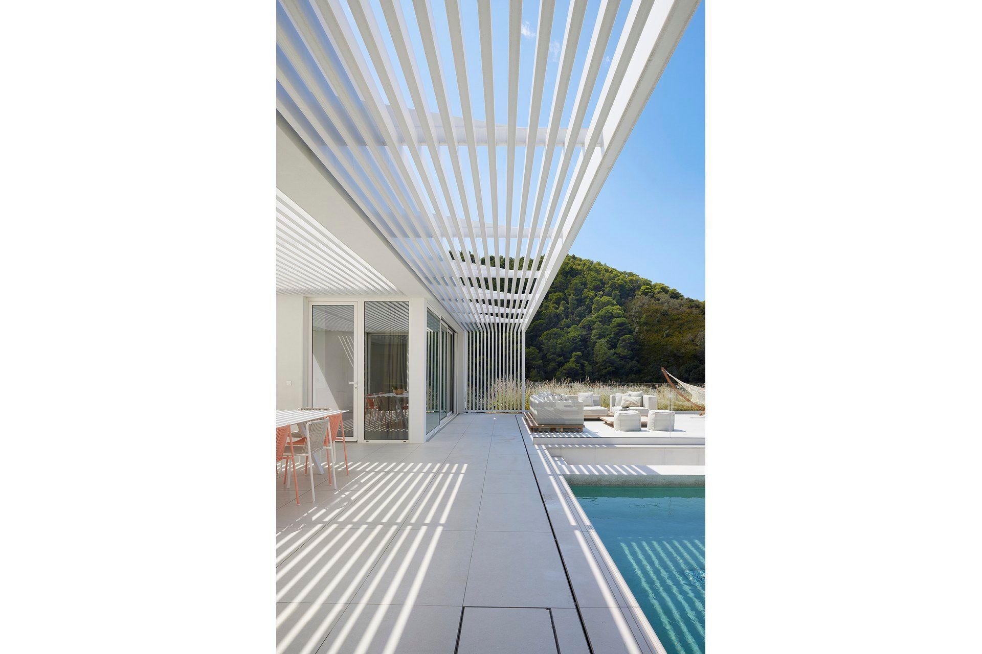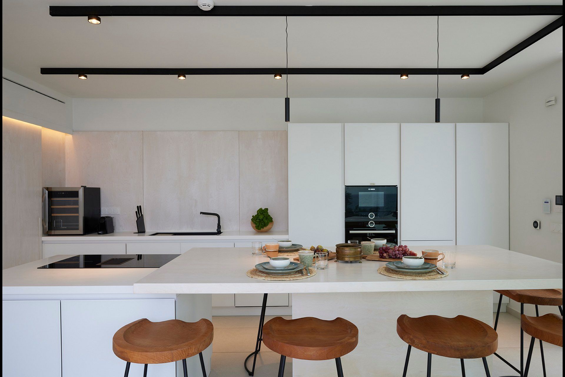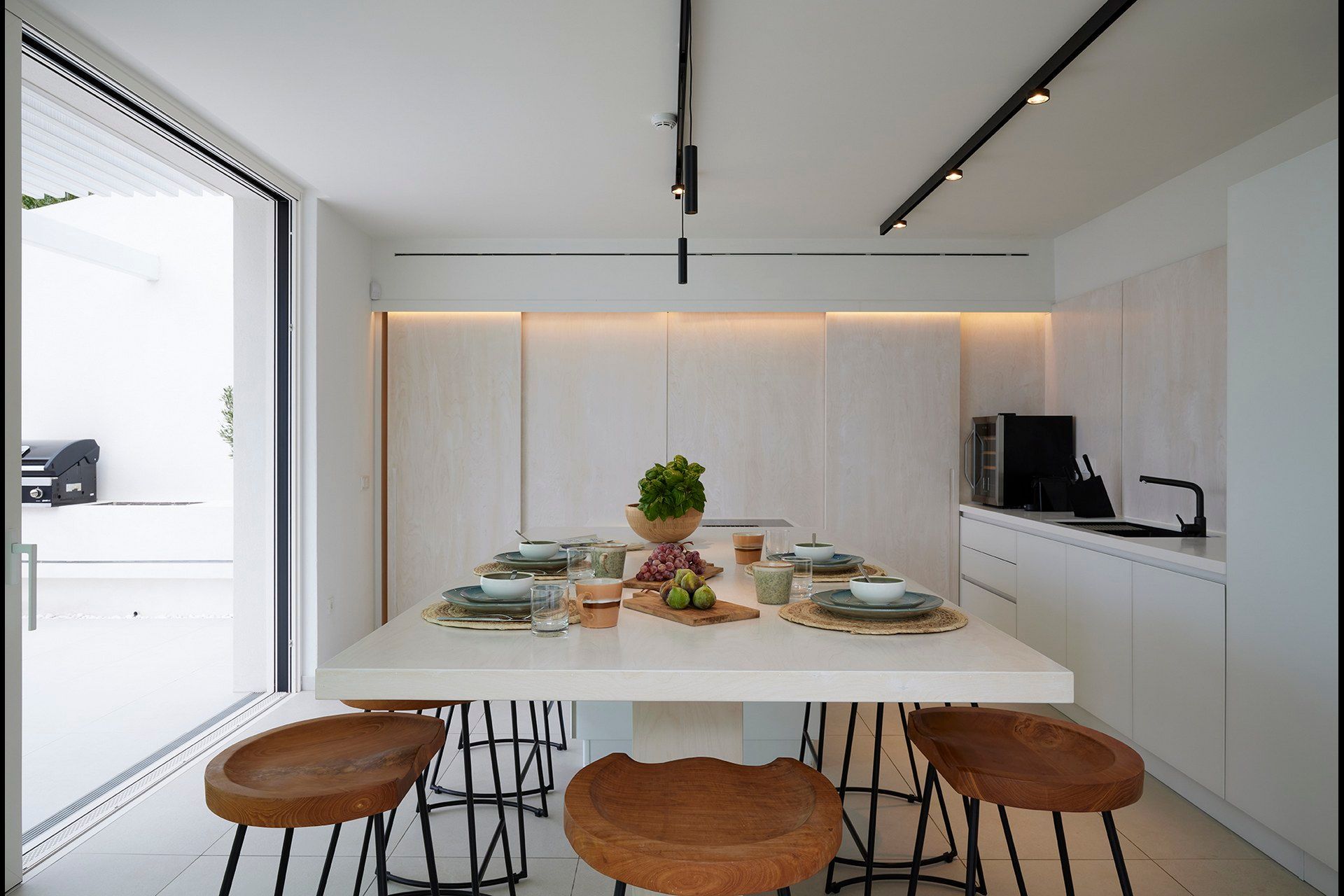 Indoors, the pool level is designed to feel open and easy, with a sea-view living room with TV and fireplace, a dining area for eight, and a fully equipped kitchen. Large openings connect the interior to the pool terrace, so the line between inside and out stays blurred in the best way. On the lower level, bedrooms open to the garden, everything is air-conditioned, and the layout works especially well for families or friends travelling together.
