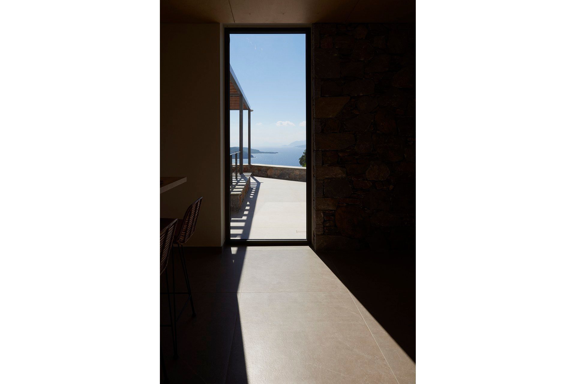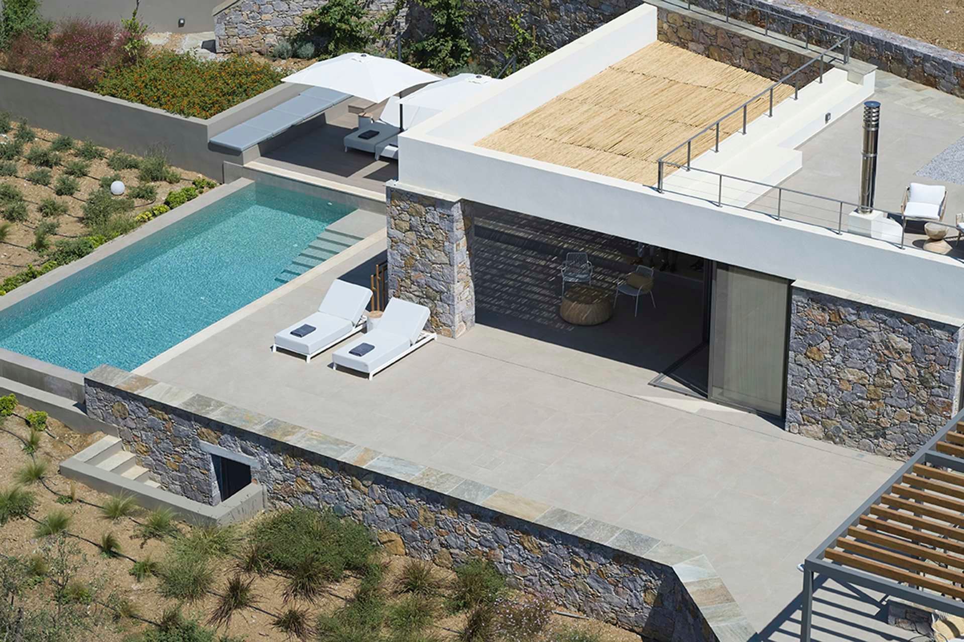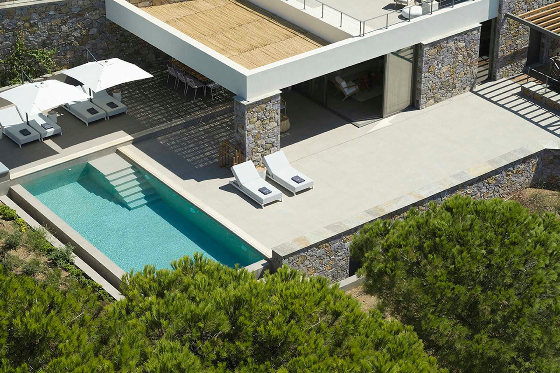 Inside, the atmosphere stays calm and intentional. The living room opens onto the pool terrace with sea views, and it includes a fireplace that makes the villa feel welcoming beyond high season. The kitchen is fully equipped and made for sharing, whether it’s breakfast before the beach or something slow-cooked after sunset. A sea-view double bedroom sits on the main level with direct outdoor access, two twin bedrooms are on the lower level, and the master suite on the top floor enjoys a private terrace that feels almost like its own little world.