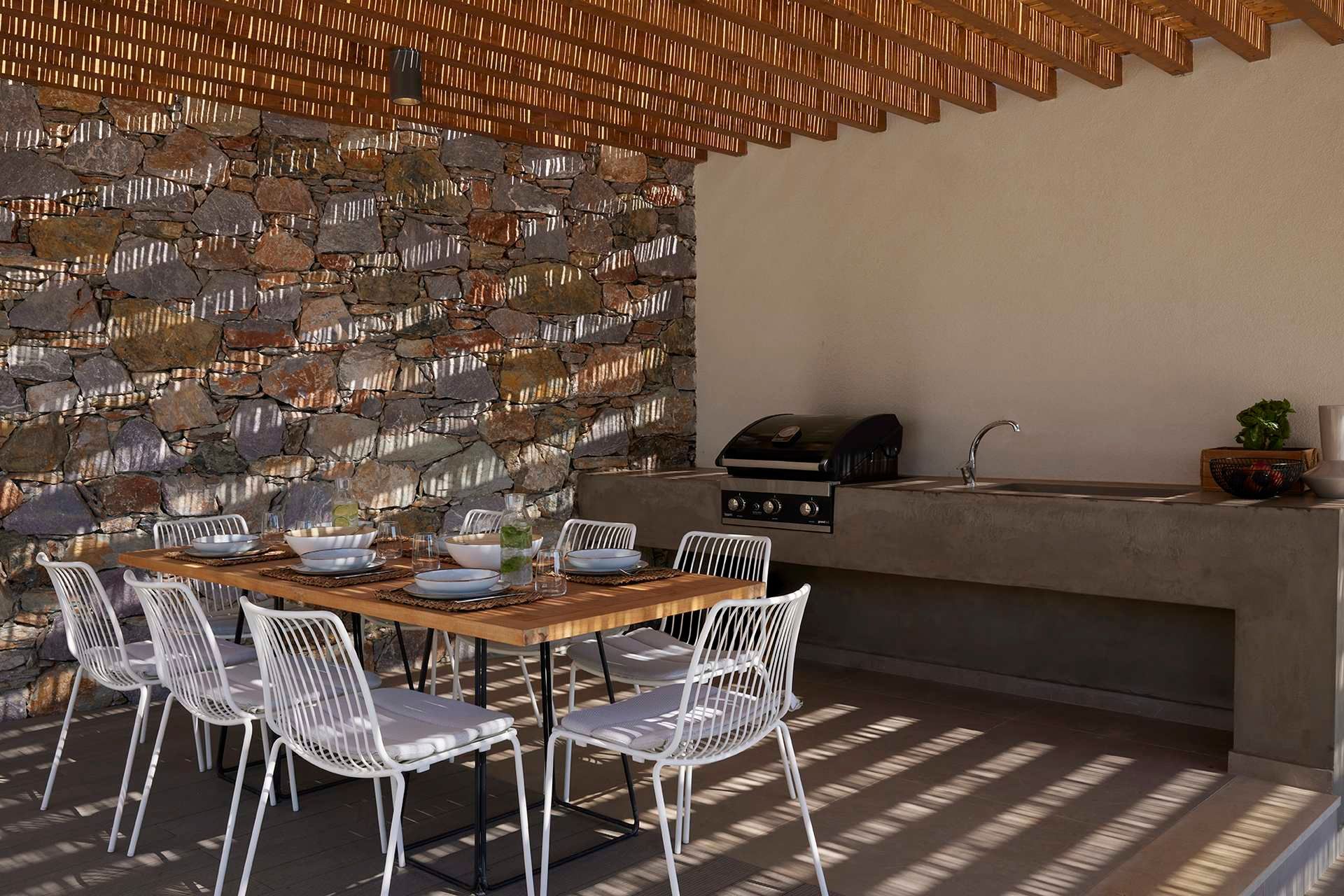 Out on the terrace, the pool becomes the center of the day, a place to swim, float, talk, or simply stare into the distance until your mind stops racing. The pool terrace is arranged with loungers, umbrellas, and relaxed lounge and dining corners, so you can follow the light and stay outdoors all day long. When you feel like cooking, the gas BBQ is available for easy meals, and the indoor-outdoor sound system brings a gentle soundtrack to the evening. The garden keeps the mood soft and private, and there’s parking for up to two cars.
