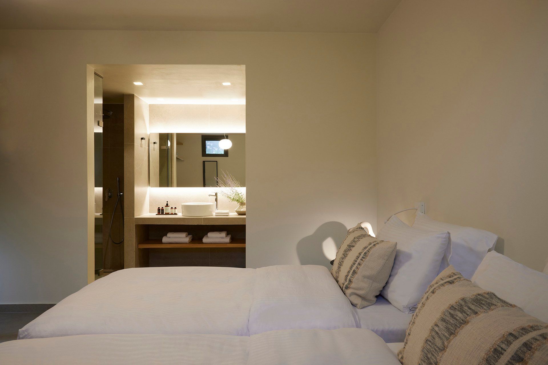 2 bedrooms, each with twin beds, ensuite bathroom, A/C