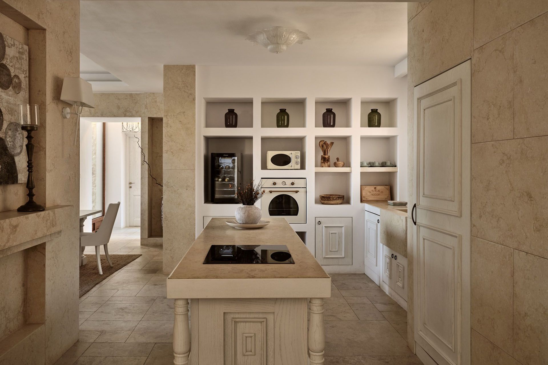 Indoors, the villa has the flow of a modern home. The living area opens directly to the pool terrace, so conversations and children’s games drift in and out without interruption. A dining table for six sits beside the fully equipped kitchen, which is set up for daily cooking as much as for simple snacks. Two king bedrooms with sea views and jetted bathtubs feel like private suites, while the twin ensuite bedroom offers flexibility for children, teenagers, or friends travelling together.
